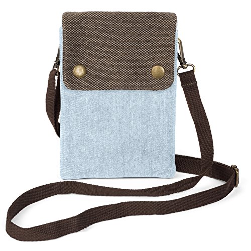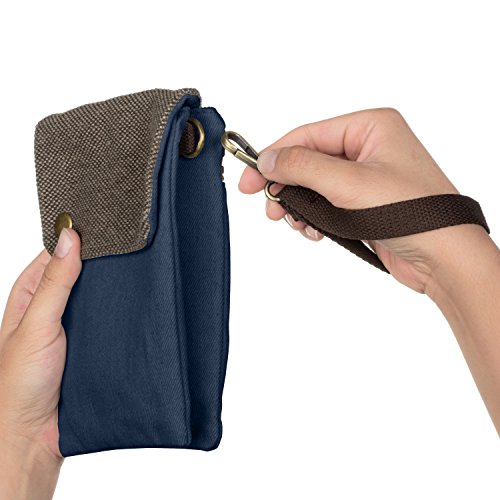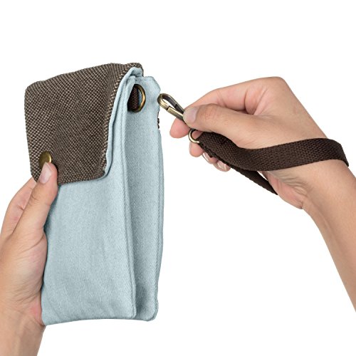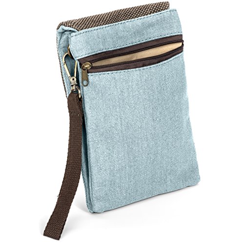 Features: - Cotton canvas material - 2 Internal pockets - 1 External zippered pocket - Textured flap with snap closure - Neck strap - Wrist band - Vinyl interior lining - Lightweight -