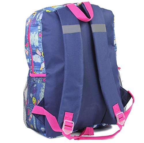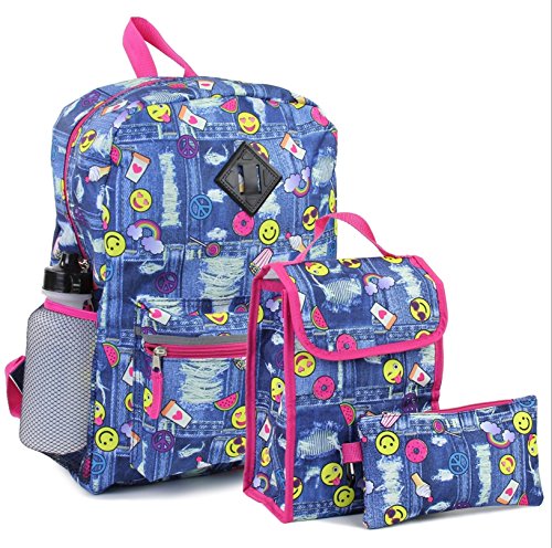 Girls Confetti Emoji 5 Piece Backpack Set. Denim/Emoji Style Print. Pack, Lunch Bag, Pencil Case & More