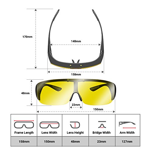 -. Feature : TAC POLARIZED UV400 LENSES FOR HD CLARITY & SAFETY Enhance your street vision with the most advanced Anti-Glare technology for HD Clarity and Personal Safety. Protect your eyes from harsh environmental elements, such as unexpected reflections, bright headlights, and the sun's harmful UV rays. Our TAC Polarized Lenses are a 7-layer composite system, complying with international UV400 sunglasses standards, designed to cut and diffuse harmful light, for an enhanced, more vivid outdoor experience / SLEEK & STYLISH FIT-OVER + WRAP-AROUND DESIGN YOU CAN WEAR ANYWHERE Timeless and classic Italian design, yet exuding ingenuity and innovation. Your Knight Visors are intuitively designed to fit as seamlessly over your prescription eyewear, as they are if worn alone. Complete with a functional flip-up feature, this fashion statement is both subtle yet sharp, for you to wear with confidence on or off the road. Available in our classic color way - Black Frames + Yellow Lenses / DURABLE FRAME CONSTRUCTION WITH REINFORCED HINGES Don't just buy new sunglasses. Invest in an all-new outdoor companion! Built to last amidst inevitable drops, scratches, and squishes. An old stand-by, our trustworthy sunglasses are made from the strongest polycarbonate materials, together with shatterproof lenses, reinforced hinges, and a protective coating. A strength and durability you can feel / OPTIMAL FORM FACTOR FOR COMFORTABLE WEARABILITY Experience the comfort and reliability of our intelligently designed full-frame Night Visors. Complete with integrated nose pads and our rubberized support system for added security. Weighing in at just 35 grams, due to our super-light and ultra-thin polarized lenses, sporting these will be effortless, easy, and virtually unnoticeable / COMPLEMENTARY ACCESSORY PACKAGE In addition to our KNIGHT VISOR WRAP-AROUND glasses, when purchasing these glasses you will get an EVA protective sports case, sunglasses pouch, micro fiber cleaning cloth, screwdriver, 10$ value car clip holder to hang your glasses safely in your car and BLUPOND'S extended warranty card.