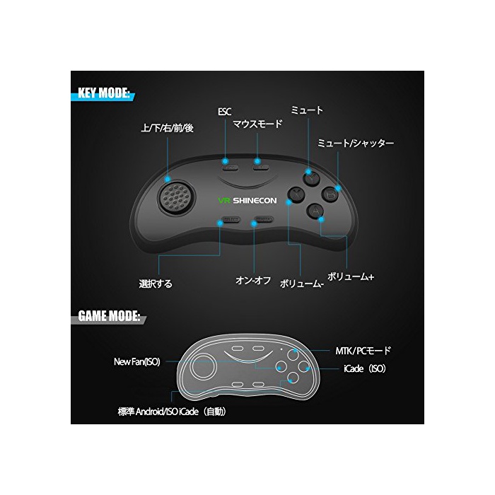 【VR 리모콘부】3D영상을 보는 시,재생,일시정지,너무 보내고, 되감고, 음량+-등 간단한 기능을 콘트롤에 옵니다.중간의 버튼은 동공 거리를 조정할 수 있어 양측에2개의 버튼은 초점거리를 조정에 옵니다.wireless 리모콘도 부착,Android의이라고 iPhone도 서포트 하고 있습니다. 《스마호》사용 쉽게 됩니다.일부분 게임의 콘트롤에는 비대응으로 됩니다.