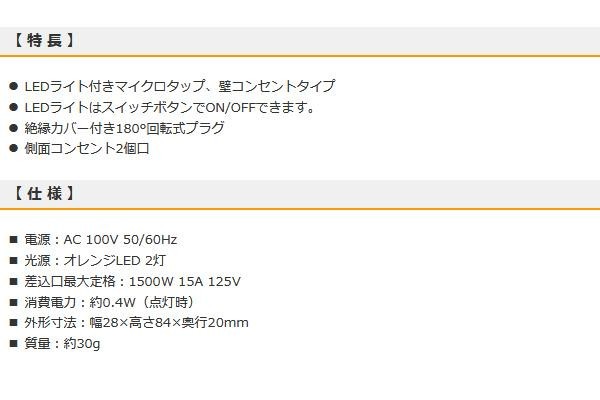 側面にコンセントが2個口ついた壁コンセントタイプのマイクロタップです。LEDライト付きなので階段や寝室等にぴったりです。