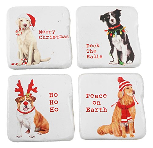 - Features a set of (4) vintage style coasters with different dog breeds & sayings; (1) says: "Merry Christmas" with a yellow lab, (1) says: "Peace on Earth" with a golden retriever, (1) says: "Ho Ho Ho" with a bulldog & (1) says: "Deck the Halls" with a collie