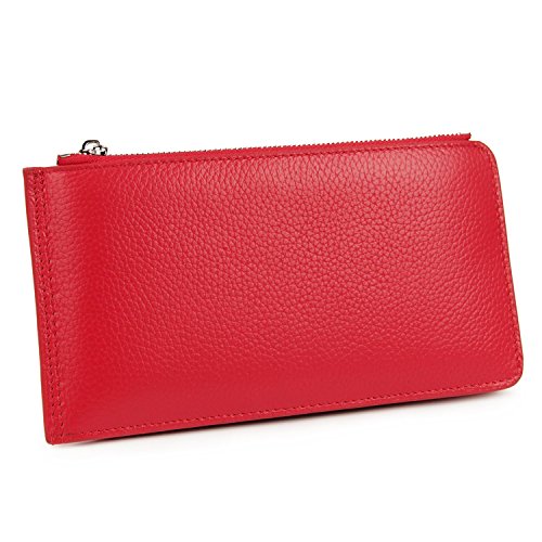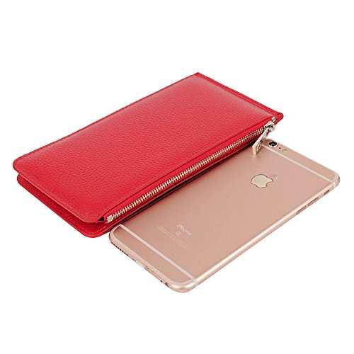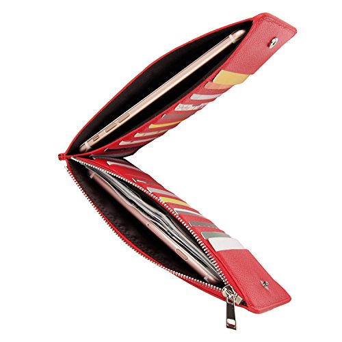 GENUINE LEATHER - Beautifully crafted in pebble top grain soft cowhide for a noticeable luxurious feel and unmatched durability. Comes With 20 card slots, 1 open pocket and 1 zippered compartment for bill/cash/change/a small cellphone,like iPhone6s / Samsung Galaxy S6.