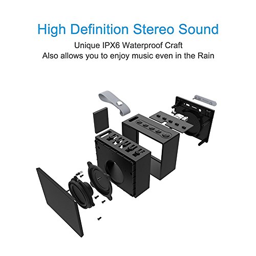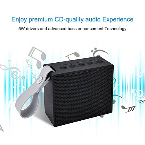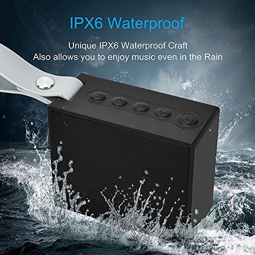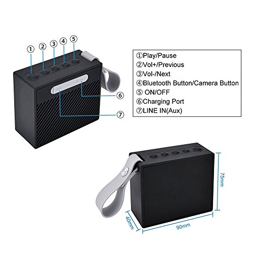 -. Feature : 1.[WATERPROOF AND DUSTPROOF]: Features unique IPX6 rated waterproof craft, it will be a water resistant, dustproof speaker, perfect for outdoor party, camping, poolside, shower, beach etc, even allows you to enjoy music in the rain. / 2.[PALM SIZE and PORTABLE OUTSTANDING]: The size for our wireless bluetooth speaker is 7.7*4*9cm , whether flat, vertical or hanging buckle, easy to carry in the pocket of the player. Compatible with all Bluetooth-enabled devices. / 3.[LONG BATTERY LIFE TIME]: Up to 10 hours play time, 1000 hours standby time and 20 hours talk time. With great mini USB charging port, which can be charged by power bank anywhere in emergency. / 4.[BLUETOOTH REMOTE CAMERA CONTROL FUNCTION]: Connected with your smartphone then press the Bluetooth key, you can do selfie anytime and anywhere.The long-range wireless Remote Camera Control features release the wisdom of your imagination life. / 5.[HIGH QUALITY SOUND]: Adopt 5W drivers and advanced bass enhancement technology let us enjoy premium CD-quality audio experience.Bluetooth V4.2 connectivity delivers smoothly without any delay.Bluetooth of the speaker ranges from 33-66 feet away (without obstacles).