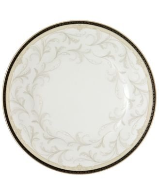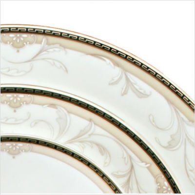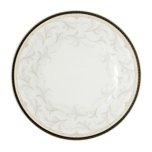 Product Description Fresh salads and decadent deserts look equally appetizing on this elegant plate that mixes natural beauty with modern accents. A wide border featuring a raised leaf design is enhanced by a repeating Greek key pattern along the rim. Platinum accents add just a touch of shimmer. 0