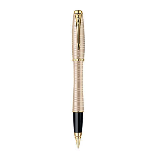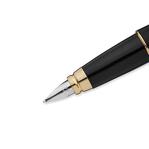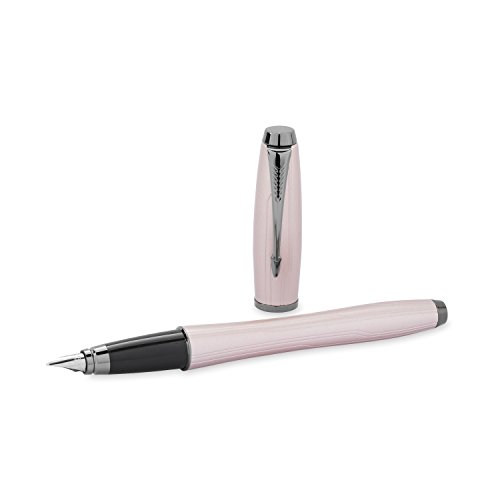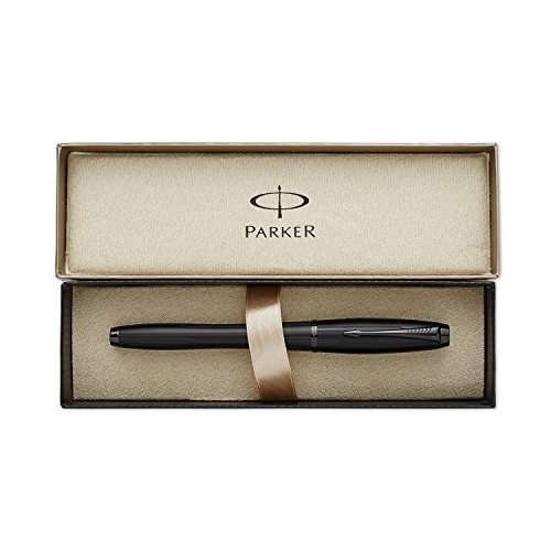 Parker Urban Fountain Pen, Medium Point, Black with Gold Trim Kit with 4 Ink Cartridges (1760841). Urban's dynamic curved design offers a bold modern look that dares to be noticed. Unconventional bullet shape for perfect weight and balance. Muted lacquered matte black finish with a powdered aspect. Stainless steel nib provides superior resistance and durability, and is designed to provide optimal writing angle for right- or left-handed writers. Includes pen, 4 ink cartridges, 2-ounce bottle of Quink ink, bottled ink converter, cleaning cloth, and "How to Write with a Fountain Pen" booklet. Limited warranty guarantees product for 2 years from date of original purchase against defects in materials or workmanship.