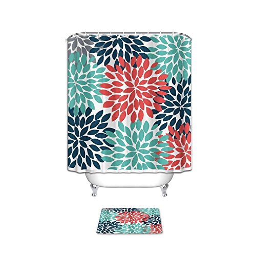 Home Multicolor Dahlia Pinnata Flower Customized Bathroom Shower Curtain (72"W x 72"H) Set with Bath Mats Rugs -Orange,Blue,Teal Bath Curtain Design