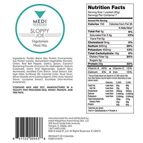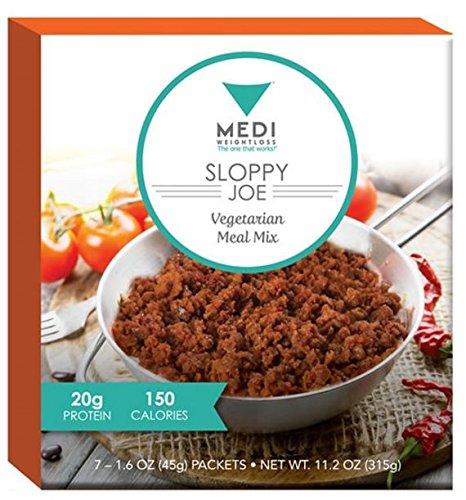 -. Binding : Health and Beauty -. Brand : Medi-Weightloss -. EAN : 0857723004347 -. Feature : Vegetarian Meal With 13g Protein / Only 100 Calories Per Serving / Zero Cholesterol And Only 1g of Fat / Great For Hunger Control During Weight Loss / Quick & Easy To Prepare -. IsAdultProduct : 0 -. Label : Medi-Weightloss -. Manufacturer : Medi-Weightloss -. PackageQuantity : 1 -. ProductGroup : Health and Beauty -. ProductTypeName : HEALTH_PERSONAL_CARE -. Publisher : Medi-Weightloss -. Studio : Medi-Weightloss -. Title : Medi-Weightloss Vegetarian Sloppy Joe - Easy to Make - High Protein (15g) - 100 Calories - 7 Meals Per Box -. UPC : 857723004347