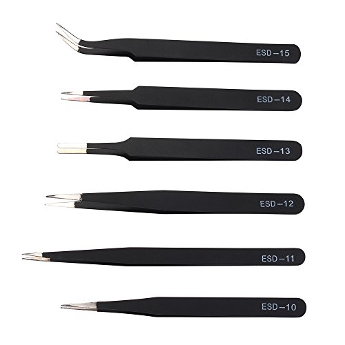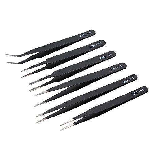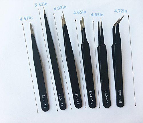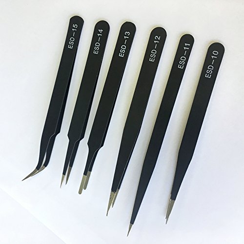 Akobearla 6pcs Stainless Steel Presicion Tweezers ESD Serial Electrical Pliers Anti-Static Tweezer Tool Kits for Electronics Jewelry-making, Laboratory Work, Nail Art Hobbies (1.0mm Thickness)