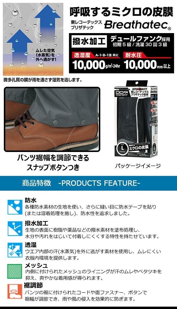 | 東レコーテックスの透湿防水素材「ブリザテック(R)」を使用した高性能レインパンツ!!ムレた空気(水蒸気)を外に逃がし、快適な着心地を実現!! |