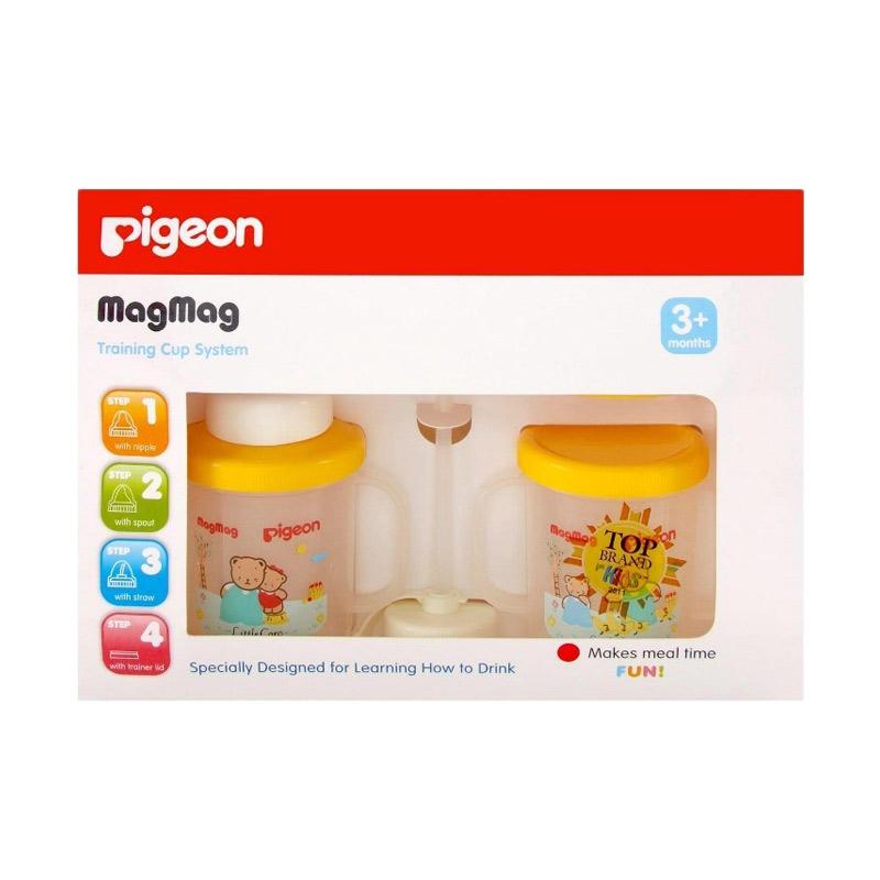 Pigeon PR050901 Mag-Mag Training Cup System merupakan training cup berbahan BPA free untuk anak usia 3 bulan ke atas yang dirancang untuk anak yang sedang belajar menstransisi dari botol ke gelas dengan menggunakan sedotan yang dapat mengubah bagian atas tempat minum. Training cup ini memiliki 3 sistem yaitu training Step 1 Nipple cup, Step 2 Spout cup, Step 3 Straw Cup. Cangkir yang dilengkapi pegangan pada kedua sisi untuk memudahkan dalam memegang gelas minumannya sendiri. Terdiri dari 2 buah gelas, lengkap step 1 sampai step 4