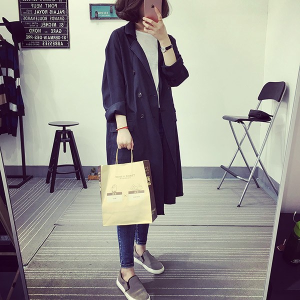 カジュアル シンプルなデザインテーラード テロンチコート トレンチ ロングカーディガン/ 紺