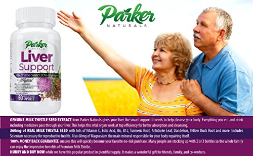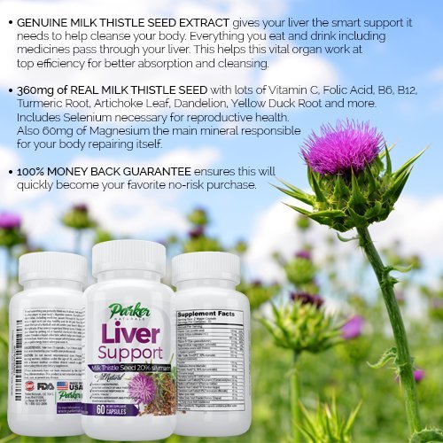 -. Feature : ★GENUINE MILK THISTLE SEED EXTRACT from Parker Naturals gives your liver the smart support it needs to help cleanse your body. Everything you eat and drink including medicines pass through your liver. This helps this vital organ work at top efficiency for better absorption and cleansing. / ★360mg of REAL MILK THISTLE SEED with lots of Vitamin C, Folic Acid, B6, B12, Turmeric Root, Artichoke Leaf, Dandelion, Yellow Duck Root and more. Includes Selenium necessary for reproductive health. Also 60mg of Magnesium the main mineral responsible for your body repairing itself. / ★100% MONEY BACK GUARANTEE ensures this will quickly become your favorite no-risk purchase. Many people are stocking up with 2 or 3 bottles so the whole family can enjoy the impressive benefits of Premium Milk Thistle. HURRY AND BUY NOW while we have this popular product in plentiful supply. It makes a wonderful gift for friends, family, and co-workers.
