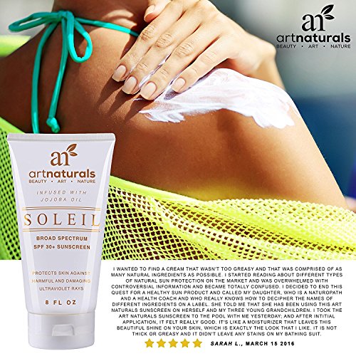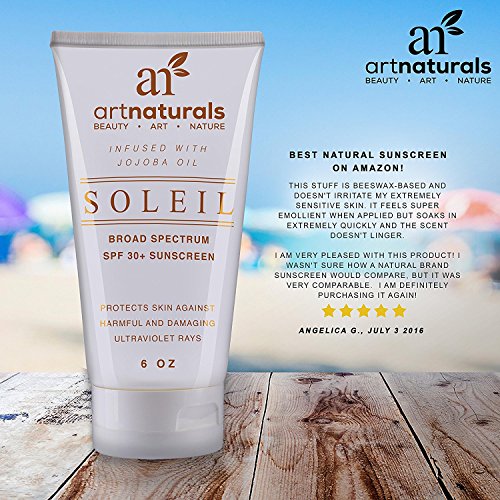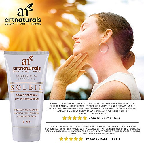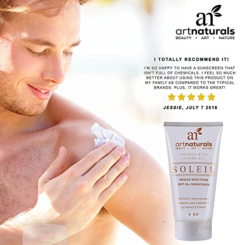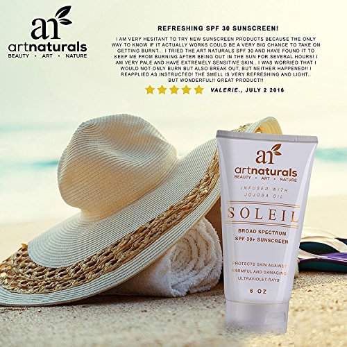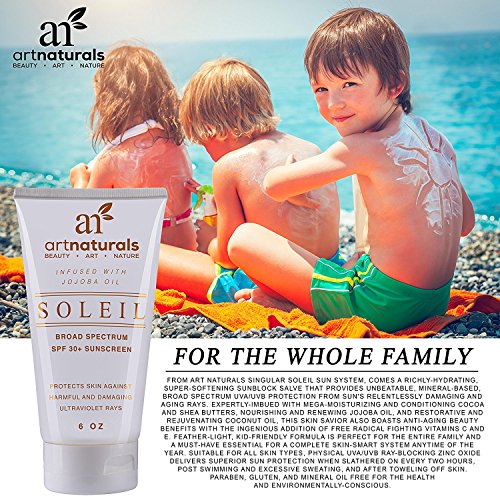 Go undercover and beat the burn while protecting and caring for your most precious asset - your skin from art naturals singular soleil sun system, comes a richly-hydrating, super-softening sunblock salve that provides unbeatable, mineral-based, broad spectrum ova/usb protection from sun's relentlessly damaging and aging rays. Expertly-imbued with mega-moisturizing and conditioning cocoa and Shea butters, nourishing and renewing jojoba oil, and restorative and rejuvenating coconut oil, this skin savior also boasts anti-aging beauty benefits with the ingenious addition of free radical fighting vitamins c and e. Unlike most sun protection formulas available, sun-sational soleil SPF 30 sunscreen instantly melts into skin, leaving behind a comfortable, beautifully-balanced, and virtually residue-free feel to skin. Feather-light, kid-friendly formula is perfect for the entire family and a must-have essential for a complete skin-smart system anytime of the year. Suitable for all skin types, physical ova/usb ray-blocking zinc oxide delivers superior sun protection when slathered on every two hours, post swimming and excessive sweating, and after toweling off skin. Paraben, gluten, and mineral oil free for the health and environmentally-conscious.Feature