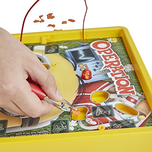 -. Binding : Toy -. Brand : Hasbro -. EAN : 0630509525928 -. Feature : Despicable Me 3 version of the Operation game / Use tweezers to collect pieces and help Dave recover / Avoid getting buzzed / Collect the most Funatomy pieces to win / Includes game tray with Minion Dave character and tweezers, 12 plastic Funatomy pieces, and instructions -. IsAdultProduct : 0 -. Label : Hasbro -. Manufacturer : Hasbro -. Model : C1342 -. MPN : C1342 -. PackageQuantity : 1 -. PartNumber : C1342 -. ProductGroup : Toy -. ProductTypeName : TOYS_AND_GAMES -. Publisher : Hasbro -. Studio : Hasbro -. Title : Despicable Me 3 Operation Game -. UPC : 630509525928 -. Warranty : No Warranty