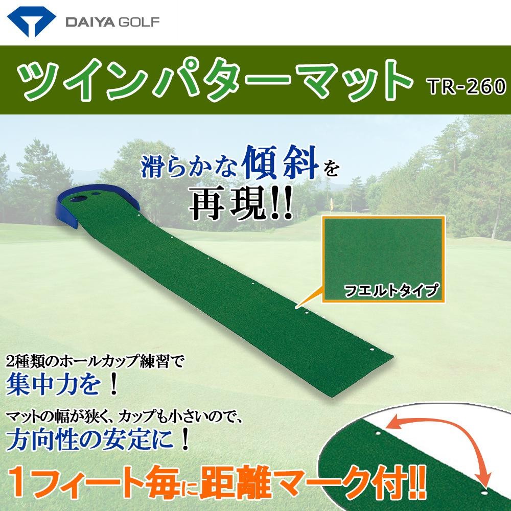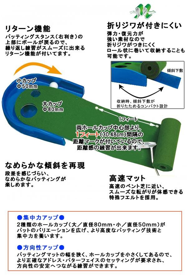 | ラウンドが決まったら、せめてパターだけでも一夜漬けして、いざコースへ!!なめらかな傾斜と高速ベント芝に近い特殊フエルトを採用。スムーズな転がりが体感できます。また、1フィート毎に距離マークが付いているので、距離感の練習に役立ちます!! |