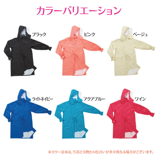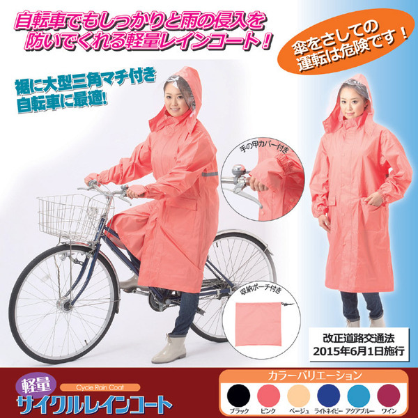 【商品名】 軽量サイクルレインコート 【ピンク】 手の甲カバー/反射テープ/大型ポケット付き フリーサイズ 【ジャンル・特徴】 自転車に最適!雨の侵入を防いでムレにくいメッシュ素材の雨合羽 ■サイズ・色違い・関連商品■ブラック■ピンク[当ページ]■ベージュ■ライトネイビー■アクアブルー■ワイン関連商品の検索結果一覧はこちら 雨の日の自転車。傘を片手に乗車するのは大変危険です。道路交通法の改正で、罰則を科せられることにもなります。そこで活躍するのが軽量サイクルレインコートです。自転車での使用を考えたカタチで、裾部分は大型の三角マチ付きでペダルを漕いでも妨げることなく、雨の侵入も防ぎます。また、袖口からの雨の侵入を防ぐために、手の甲部分を覆うカバーが付いてます。頭部は顔が濡れにくい日差し付きで、脱着もカンタン。背中部分には、反射帯が付いていて、夜間に車のヘッドライト等の光で反射、相手側から見つけやすくなってます。裏地にはムレにくく快適性を保つメッシュ素材を採用。コンパクトになる収納袋付き。■商品スペック【商品名】軽量サイクルレインコート ピンク 【サイズ】適応サイズ/身長155~170c