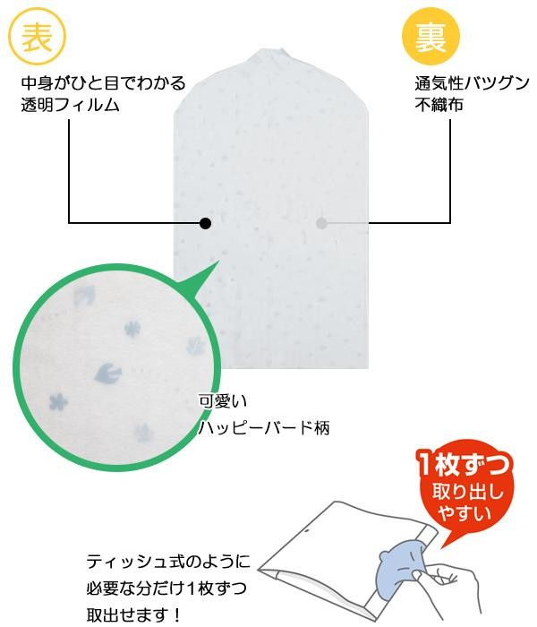 裏面には通気性の良い不織布、表面には中身が一目で確認できる可愛い柄入りの透明フィルムを使用。大切な衣類をホコリや湿気から守ります。ティッシュ式のように必要な分だけ1枚ずつ取り出せます。フィルム面には可愛いハッピーバード柄がプリントされています。ショートサイズのスーツカバーと、コートやワンピースに対応したロングサイズのコートカバーをセットにしました。 |