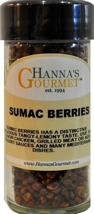 -. Binding : Misc. -. Brand : HANNA'S GOURMET -. EAN : 0700075001598 -. Feature : Comes in 4 fl. Oz. glass jar / 100% NATURAL / 100% PURE / STAR K CERTIFIED -. IsAdultProduct : 0 -. Label : JR SPICE CO -. Manufacturer : JR SPICE CO -. PackageQuantity : 1 -. ProductGroup : Grocery -. ProductTypeName : GROCERY -. Publisher : JR SPICE CO -. Studio : JR SPICE CO -. Title : SUMAC, BERRIES -. UPC : 700075001598