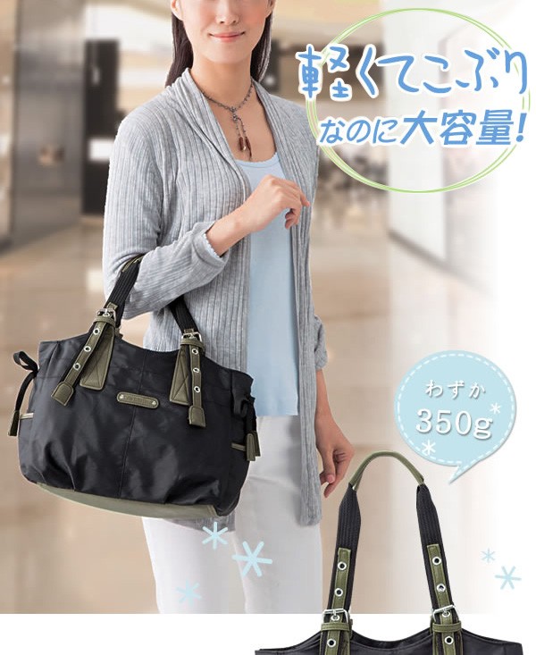 | 軽くて丈夫なポリエステル素材なので、ヘビーユースにぴったり!マチが広くポケットも充実しているので、見た目よりも荷物がたくさん入ります。黒とカーキグリーンのシックなカラーリングが上品。 |