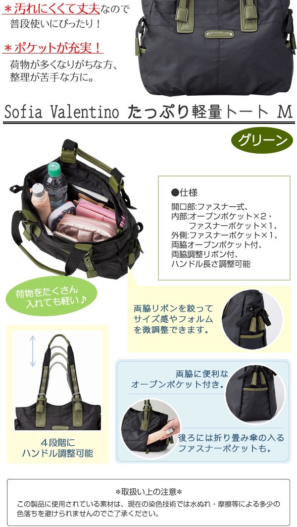 | <h1>軽くて丈夫なポリエステル素材なので、ヘビーユースにぴったり!マチが広くポケットも充実しているので、見た目よりも荷物がたくさん入ります。黒とカーキグリーンのシックなカラーリングが上品。軽量/トートバッグ/たくさん入る/軽い/小さめ/普段使い/ポケットいっぱい/sofiavalentino/汚れにくい/</h1> |