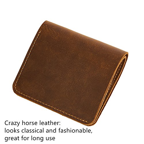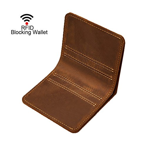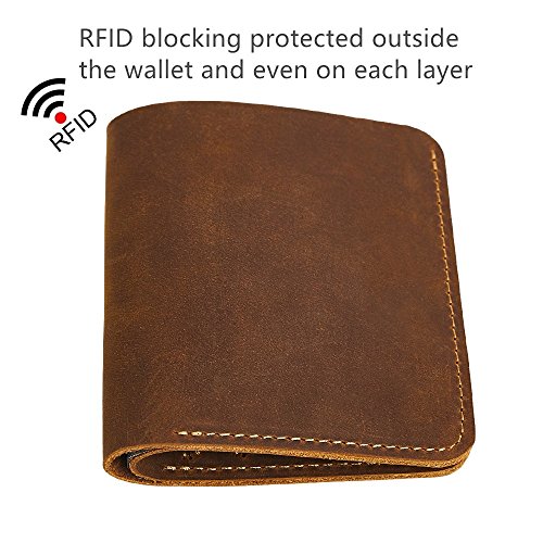 Specifications: Ultimate slim size: 3.5" X 3.9" X 0.59", Space-saving design can fit in your shirt or jacket pocket perfectly Outer Material: Genuine crazy horse leather Inner Material: RFID signal blocking material layers 1 bill compartment and 4 card slots with RFID secure Old fashion vintage color: Crazy Horse Coffee, Crazy Horse Deep Brown Weight about 2.3oz Imported ,