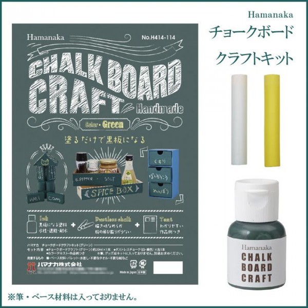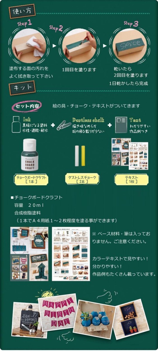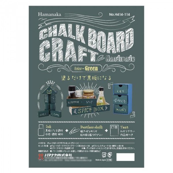 わかりやすいテキストと粉の飛び散りが少ないダストレスチョークがついた便利なキットです。懐かしい「黒板」と言えばこれ。なじみの良いグリーンでノスタルジックな雰囲気に。