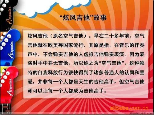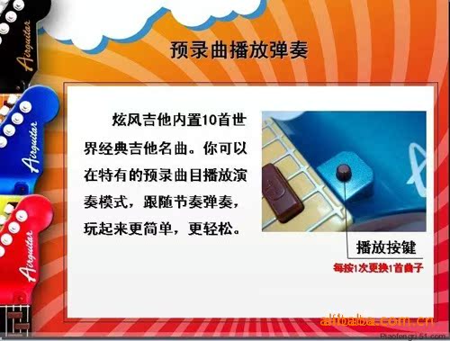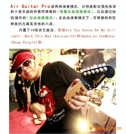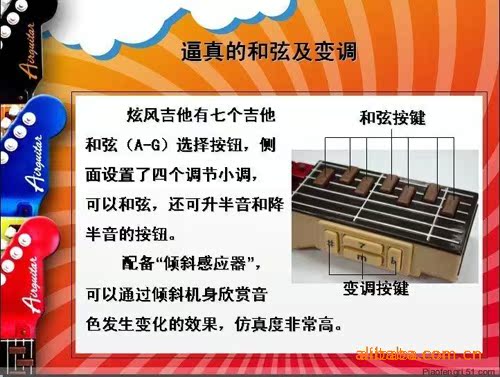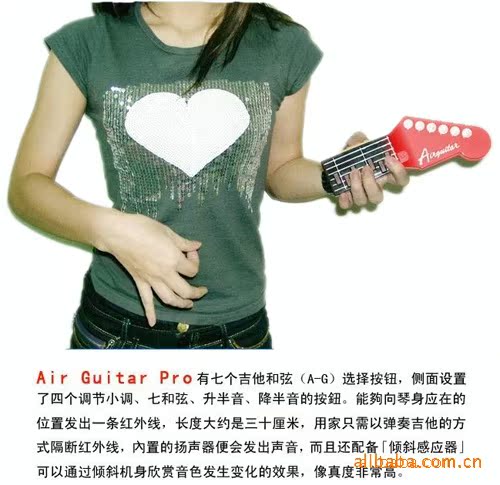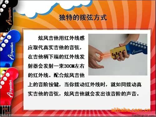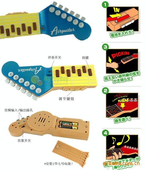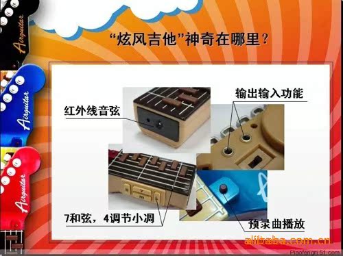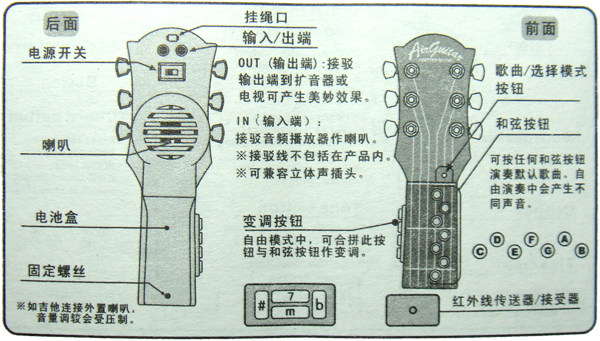 The head of the guitar part has seven guitar chords (A-G)selection button? side set up four adjustment minor? seven chord?sharp? flat button. In the second half of the handle end is provided with an infrared emission receiver can send out an infrared to the body should be in the position? length is about thirty cm? with buttons? only need to play the guitar mode partition infrared? built-in speakers will sound like a very high degree.