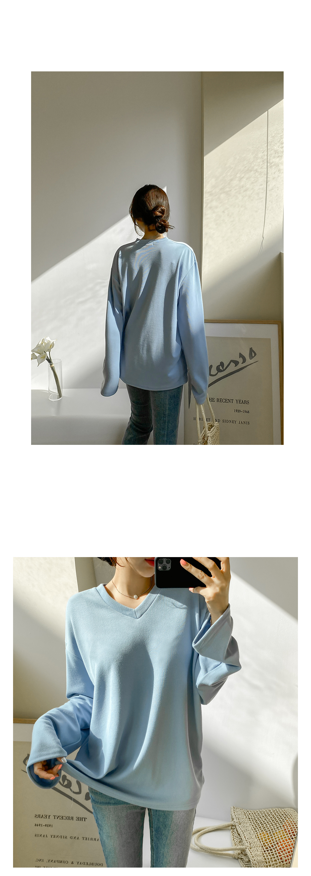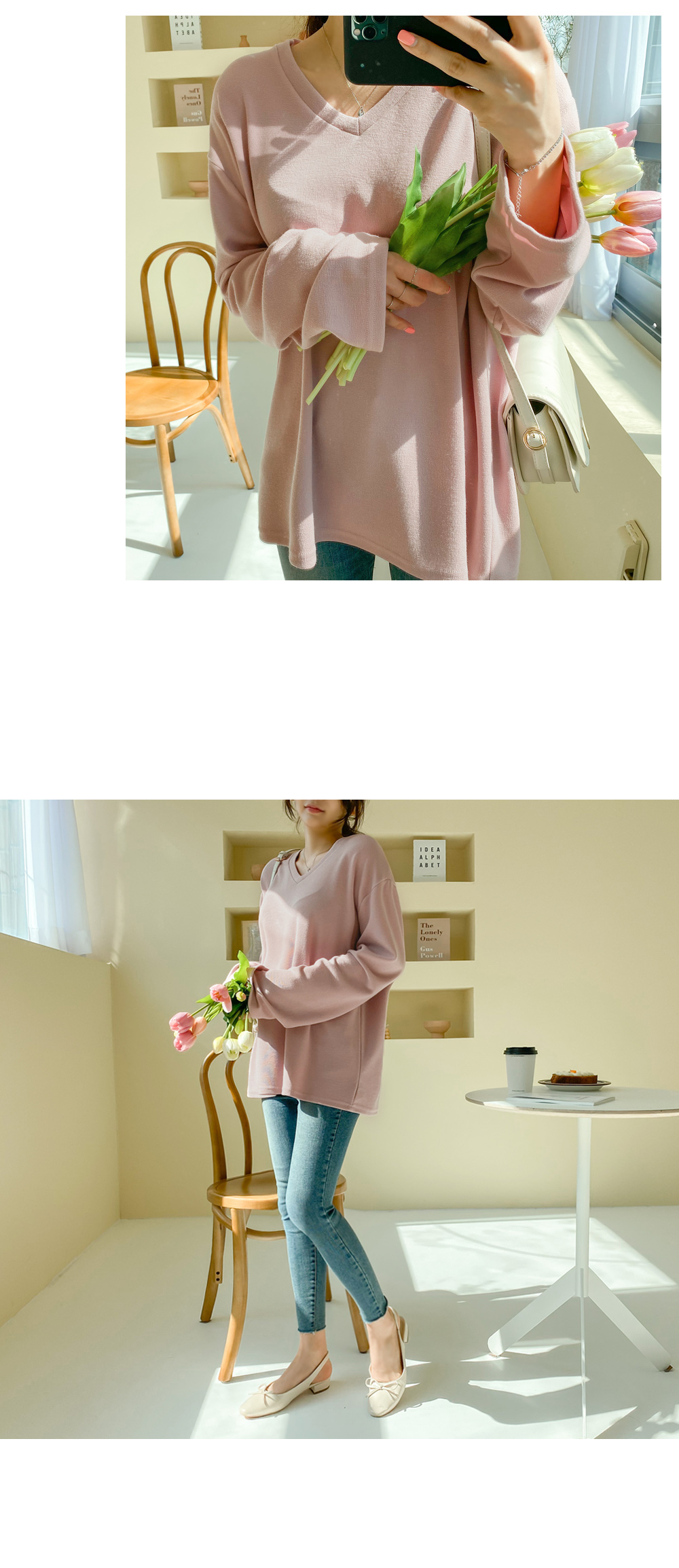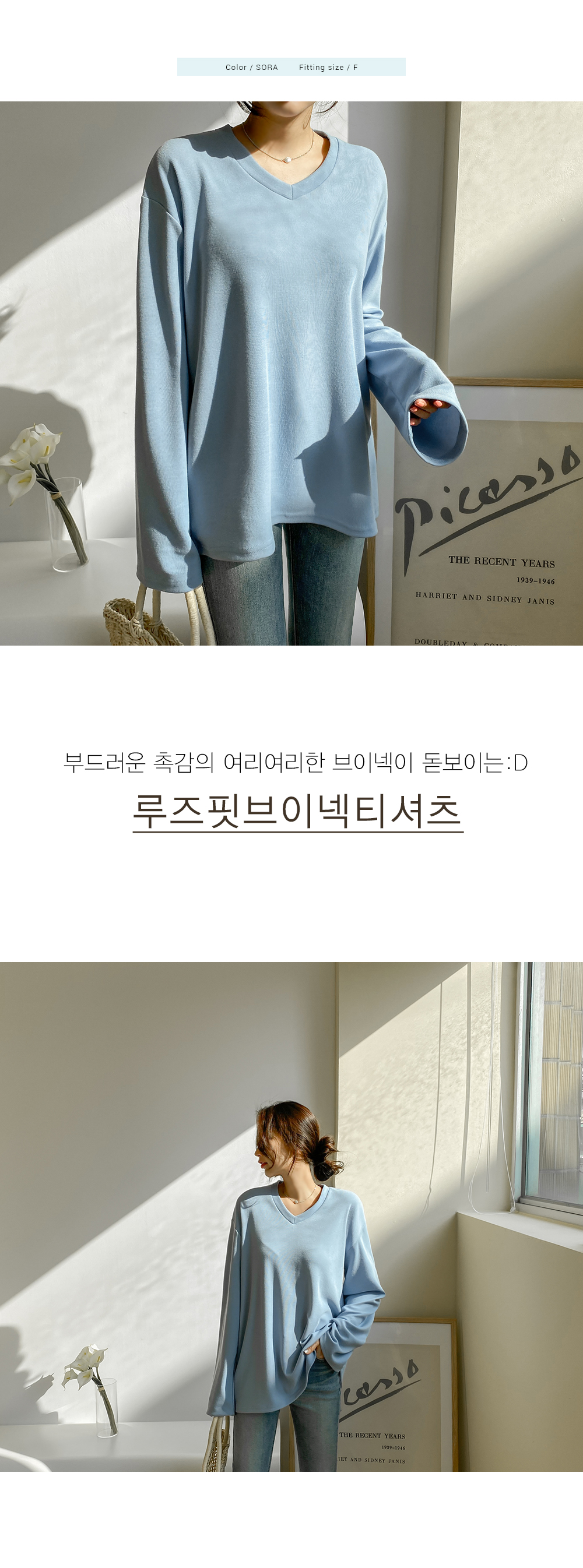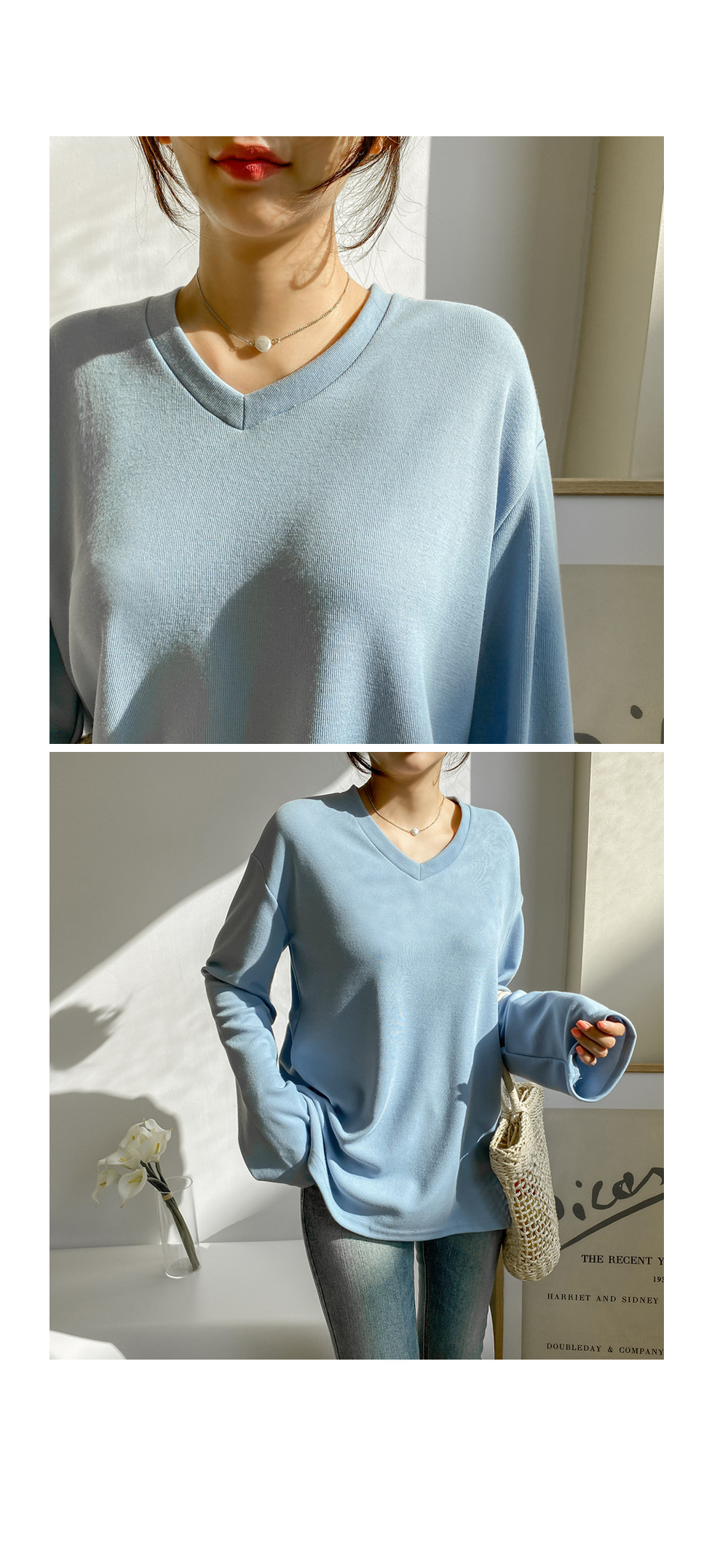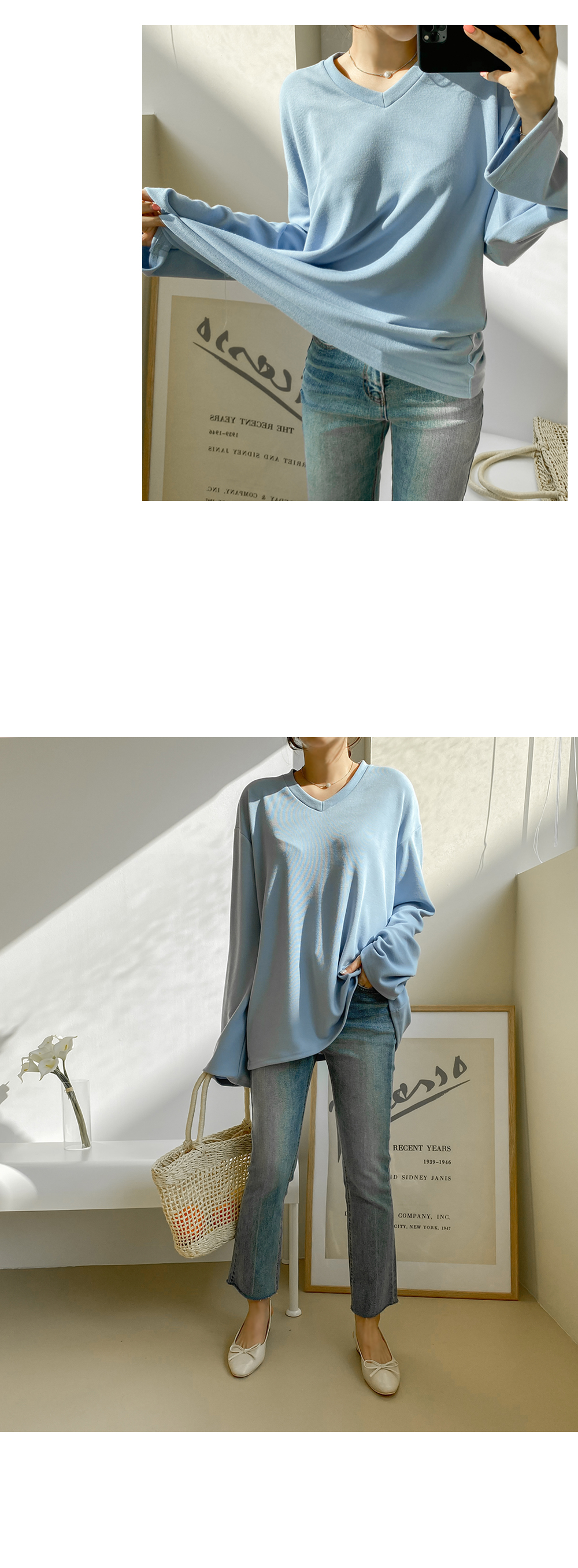 루즈한 핏감의 브이넥 티셔츠에요.
