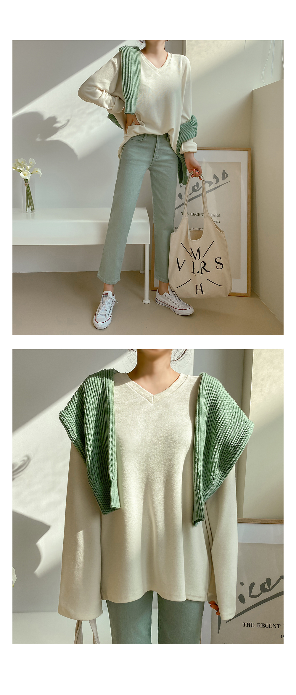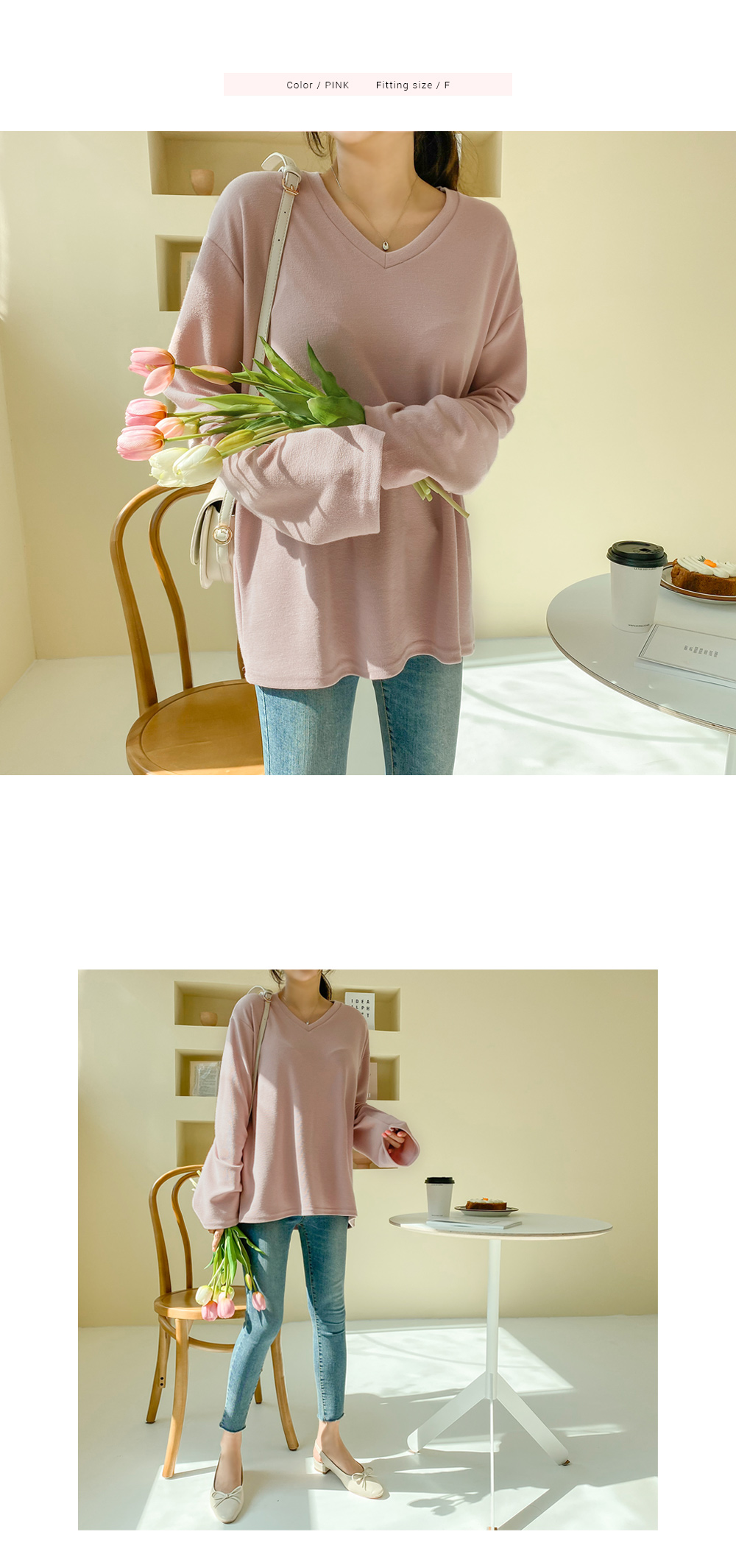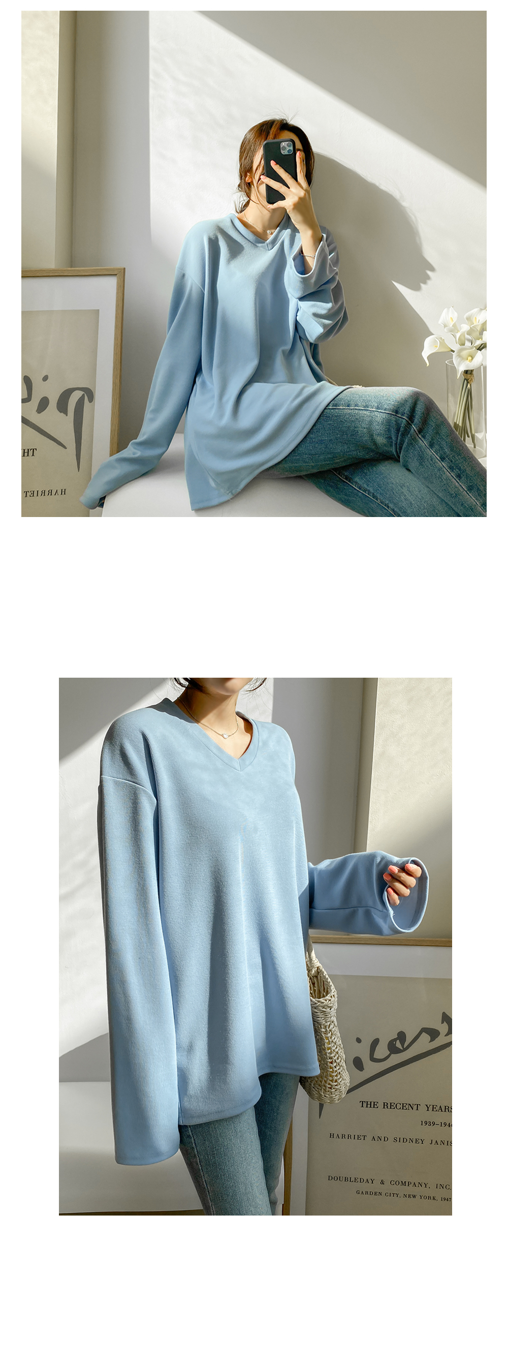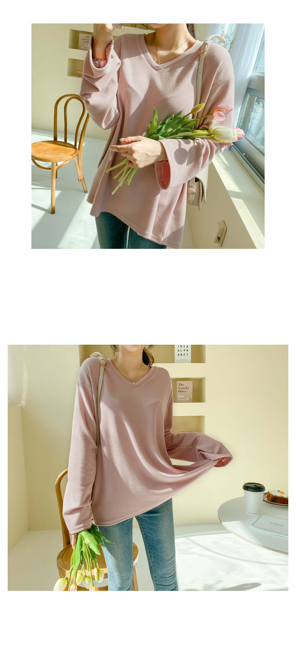 루즈한 핏감의 브이넥 티셔츠에요.