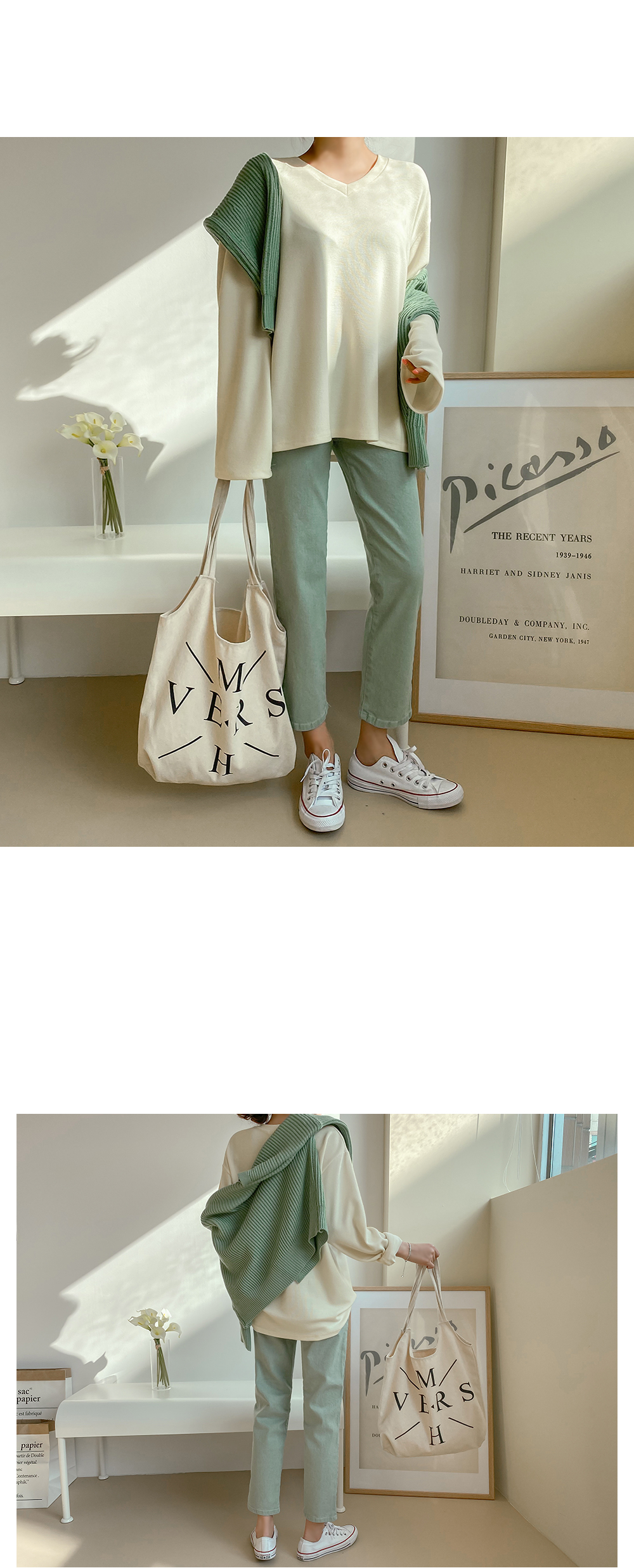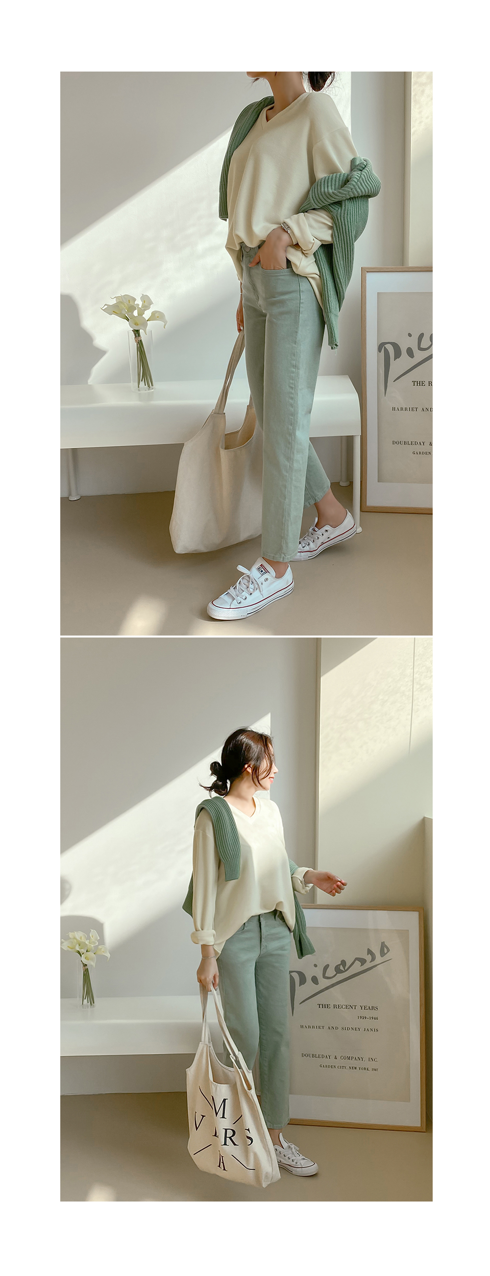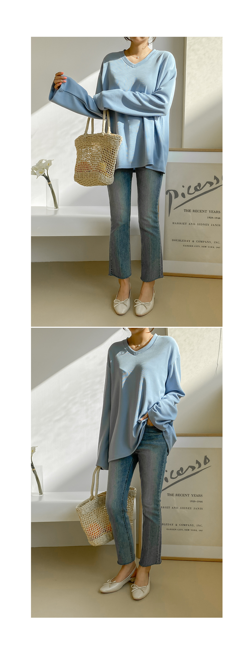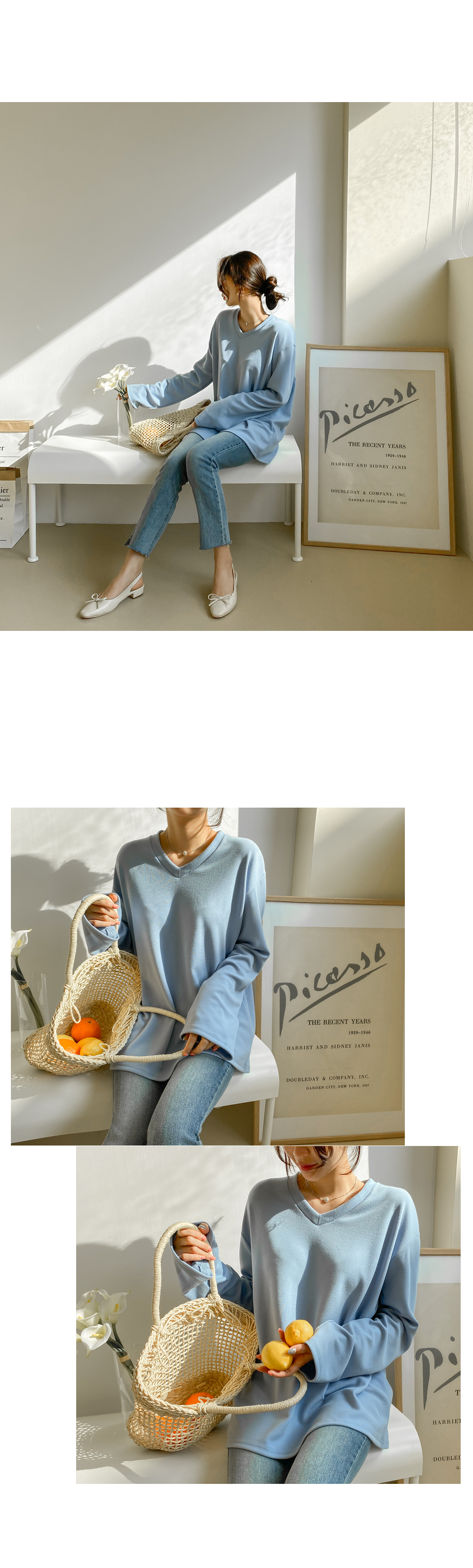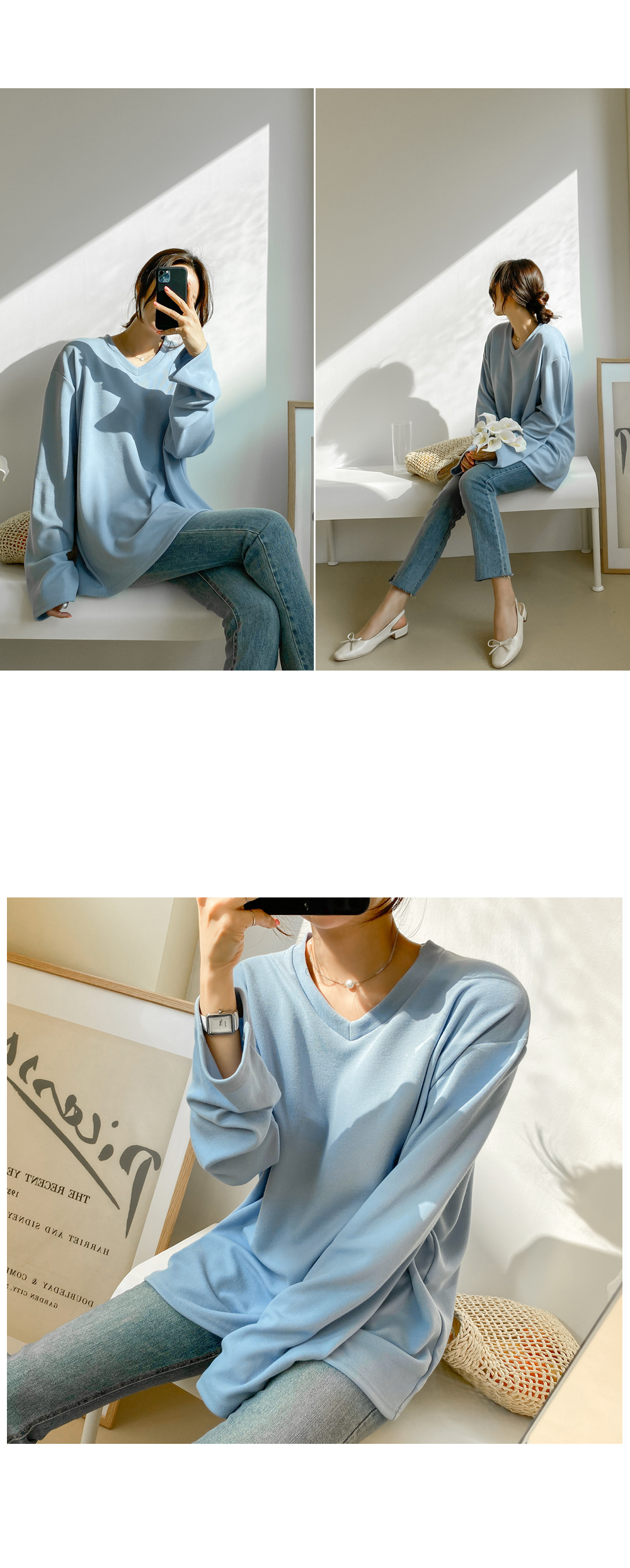 루즈한 핏감의 브이넥 티셔츠에요.