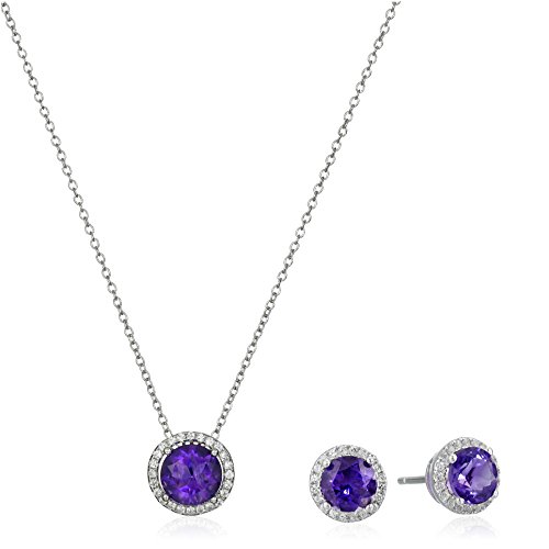 Set of pendant necklace and earrings featuring round genuine amethyst or swiss blue topaz, surrounded by white sapphire halo