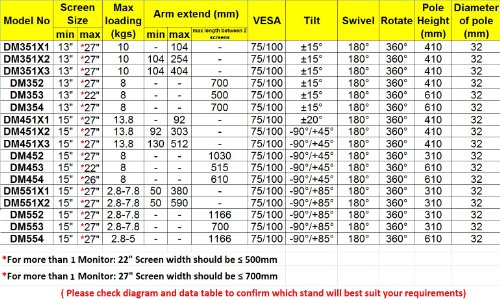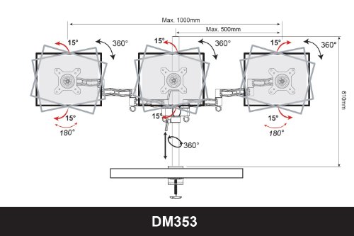 - Feature : The Duronic DM353 is a desktop mount for 3 monitor or a TV. / The DM353 has fully adjustable double arms which gives great flexibilitity in posioning your monitor. Please see movement image for full clarification / This stand is suitable for types of TV's and monitors of size 13-22" (Please see size data image to establish if this stand will fit your Monitor. Please measure the width of your monitor against width our data)which have VESA 100 or VESA 75 mounting holes (the horizontal and vertical distances of the holes at the back of the TV must be 75 or 100mm, approximately 2.9 and 3.9 inches) / This stand will allow you to move the arms up or down and swivel right and left 360°, you can also turn the montior around. Changing positions are very easy to do and do not required any further tools / Extra strong clamp installed on the unit to provide excellent and secure stability. The stand will allow you to put on a monitor of weight up to 17lbs on each bracket. Standard monitor accessories included