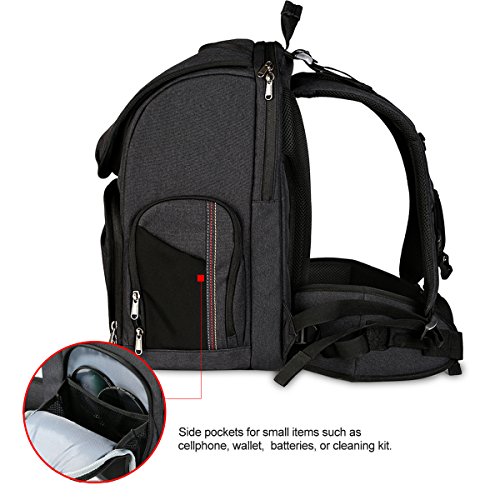 √Dimension:10.6"*8.5"*17.7" , Capacity: 1 Camera + Multiple Lenses, Net Weight:3.7lbs Spacious main compartment holds one camera and multiple lenses, flashlight, and its removable dividers made of PE board and EPE foam stabilize your gear without hurting it.