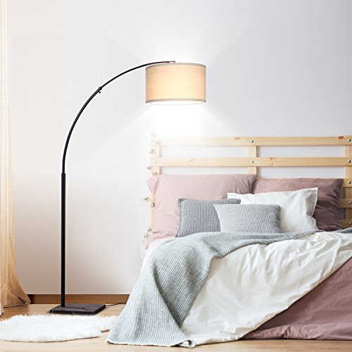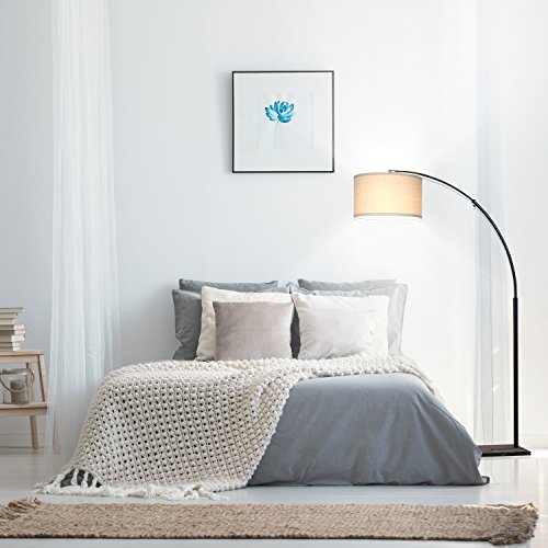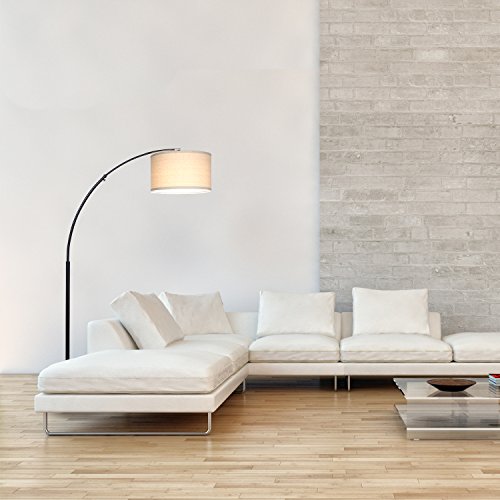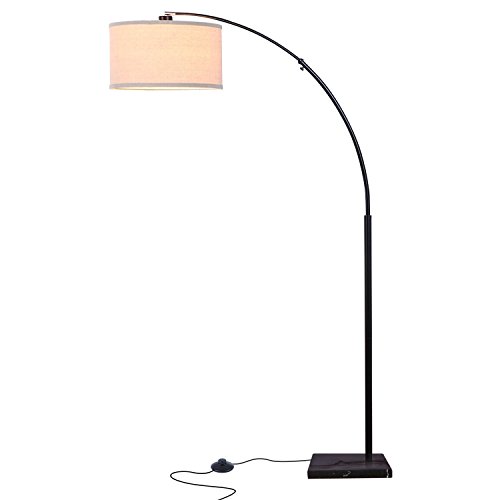 - ADJUSTABLE OVERHEAD LIGHTING: The gentle arc of this lamp curves the light of its unique cylindrical shade into an overhead position and can be perfectly positioned over any furniture piece. The adjustable arc telescopes up to 44 in from the pole to further adjust the light for reading, knitting, and other hobbies. The max height is 76 in making it perfect for rooms with high ceilings. The heavy weighted rectangular base measures 11 in x 14 in x 1.5 in so that it slides easily under furniture.