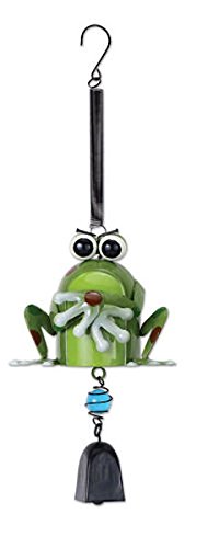 - Painted metal frog with silly, grumpy expression; accented with a marble and bell
