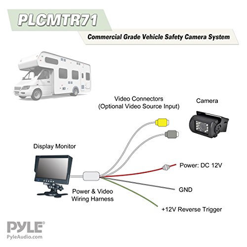 The PLCMTR Camera and Monitor System comes equipped with everything you need to add an extra set of eyes when driving and parking. Comes equipped with LED Lighted IR Night Vision Illumination Camera, 7 Inch color LCD Monitor, 50 foot connection cable, remote control, wiring harness and universal monitor mount. This system is designed for your Bus, Trailer, Van, Truck, Big Rig or other vehicle with 12-24 Volt Systems. Additional features include anti-glare monitor sun shade, widescreen video display, auto image adjustment and more. Drive safer, get into those tight parking spots and keep your eyes on the road with the Pyle PLCMTR Camera Systems. System: Pal/NTSC Auto Switching - DC reverse 12-24 Volt Trigger with Auto Activation feature - Image sensor: Color CMD - Lens Angle: 170 Degree - Designed for Car/Truck use with 12 and 24 Volt Systems. 7 inch TFT LCD Display - OSD Menu Control - Designed for Car/Truck use 12 and 24 Volt Systems - System: Pal/NTSC Auto Switching - IP Rating: IP-68 - Camera Dimensions: 3.18"W x 2.95"H x 2.17"D. Dual RCA Audio and Video Inputs - Built in Speaker System - CMD Rearview Camera System - Resolution: 420 Lines - 18 LED Lights with IR Night Vision Illumination.Feature