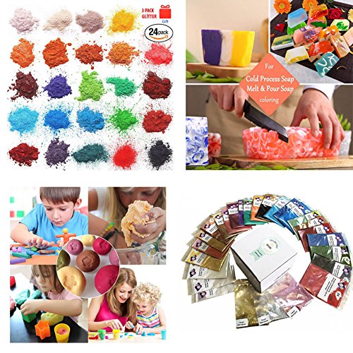 - ✔PIGMENT POWDER: The 24 coloring soap bath bomb dyes in this set one mica powder dyes that melt fast and easy and are ideal for soap making you can only dream of.These organic mica powder for soap molds are bath colorants as well as superb soap dyes like another ones.Also 3 pack glitter let you be a gift.