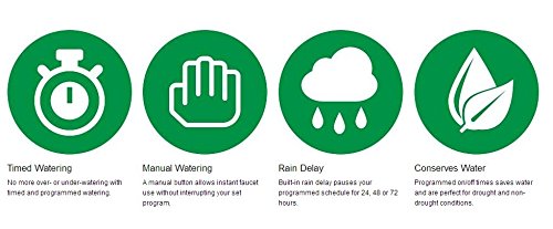 -. Feature : Super-simple programming gives flexible control of watering duration and frequency / Rain delay and manual watering functions ensure maximum water conservation / Up to 4000 on and off cycles from just two alkaline batteries (sold separately) / Extra-large LCD with bright, vivid text provides best-in-class readability / Saves water in drought conditions