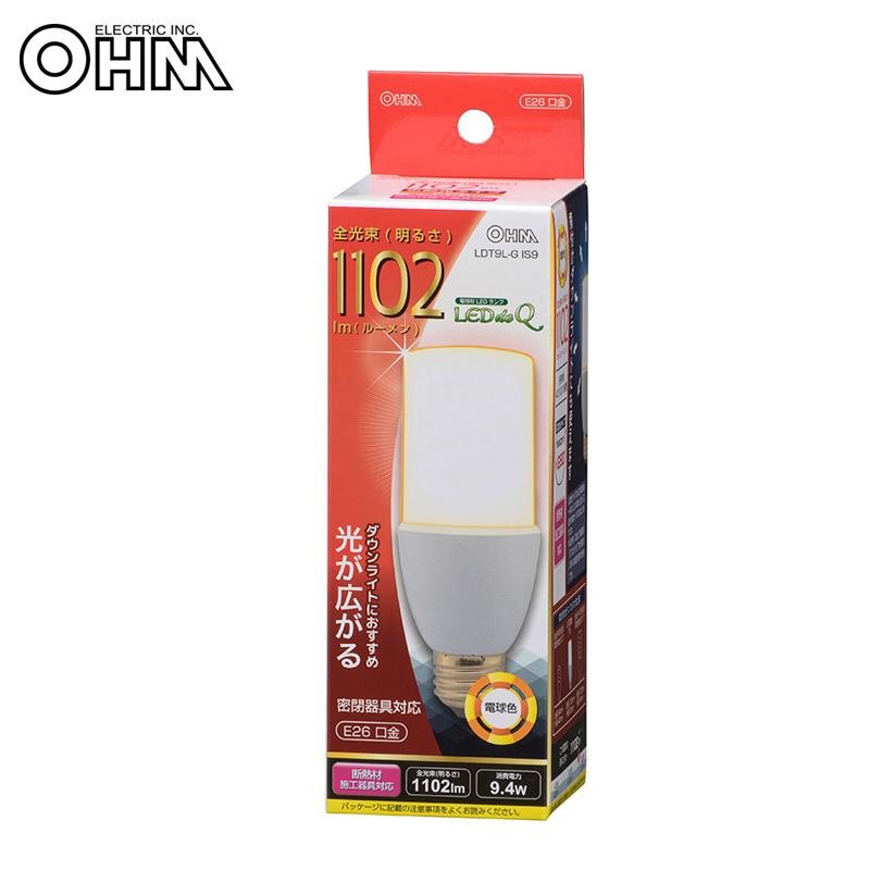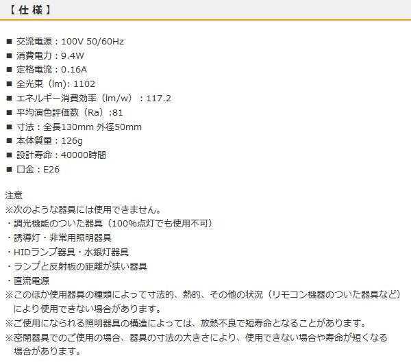 | 消費電力9.4Wで1102ルーメンの明るさ。密閉器具、断熱材施工器具にも対応。口金下向き器具だけではなく、口金横向き、斜め付け器具にもご使用いただけます。光色は電球色で屋内専用です。 |