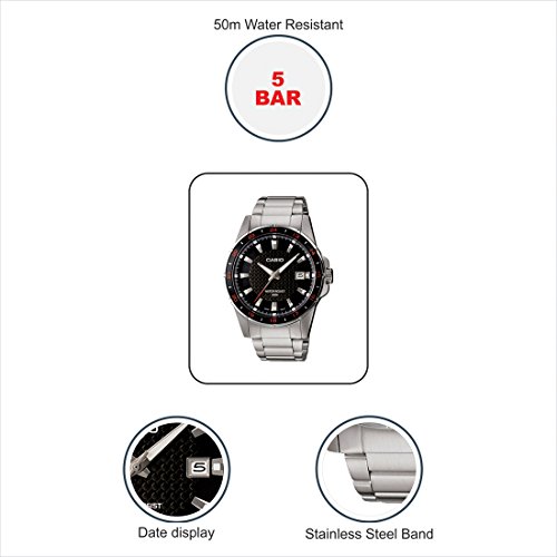 Brand, Seller, or Collection Name:Casio Model number:EAW-MTP-1290D-1A1V Part Number:A413 (A413) Item Shape:Round Dial window material type:Mineral Display Type:Analog Clasp:Fold-Over Clasp with Single Push-Button Safety Case material:Stainless steel Case diameter:42 millimeters Case Thickness:10 millimeters Band Material:Stainless steel Band length:Men's Standard Band width:25 millimeters Band Color:Silver Dial color:Black Bezel material:Stainless steel Calendar:Date Special features:Luminous, measures-seconds Item weight:7.84 Ounces Movement:Quartz Water resistant depth:50 Meters