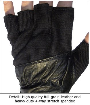 -. Feature : High quality full-grain leather / 3.5" (9cm) wide flexible wrist wrap for maximum wrist stability / Double thickness reinforced leather palm for maximum durability / Extra long wraps go a full 3 times around wrist for unparalleled support / Heavy duty 4-way stretch spandex across knuckles and fingers