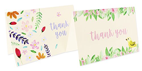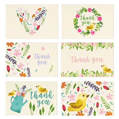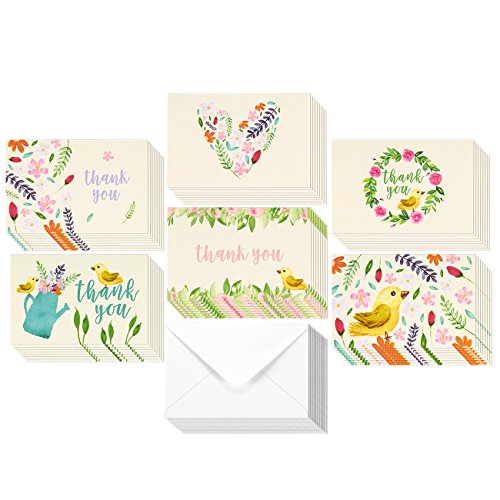 48 Assorted Pack Thank You Note Cards Bulk Box Set - Blank on the Inside - 6 Vintage Garden Watercolor Floral Flower Bird Designs - Includes 48 Greeting Cards and Envelopes - 4 x 6 Inches