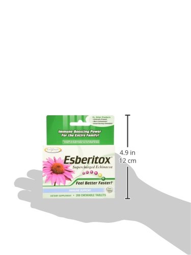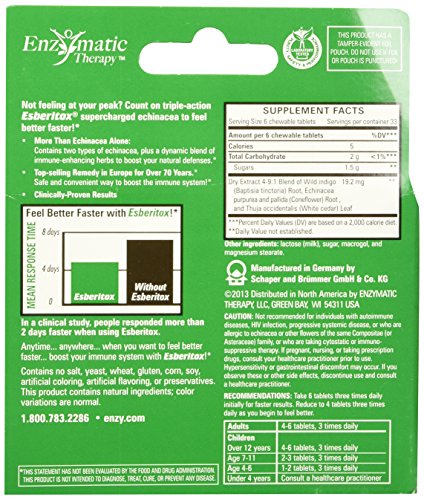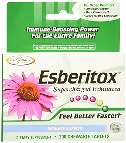 -. Binding : Health and Beauty -. Feature : Enzymatic Therapy Esberitox, 200 chewable tablets. Pack of 1 / Esberitox is a combination of two types of Echinacea plus two immune-enhancing herbs, Baptisia and Thuja, which arm your body's defense system for a speedy return to feeling your best! / Product of Germany / Serving Size: 6 Chewable Tablets -. IsAdultProduct : 0 -. Label : Enzymatic Therapy -. Manufacturer : Enzymatic Therapy -. PackageQuantity : 1 -. ProductGroup : Health and Beauty -. ProductTypeName : HEALTH_PERSONAL_CARE -. Publisher : Enzymatic Therapy -. Studio : Enzymatic Therapy -. Title : Enzymatic Therapy - Esberitox Blister Pack, 200 tablets