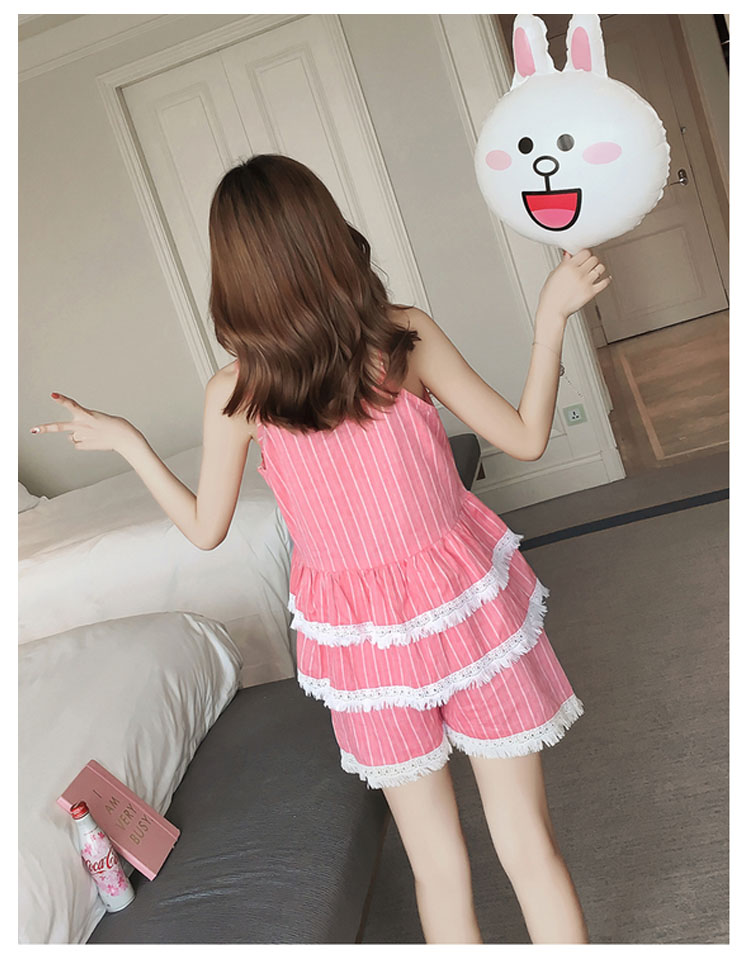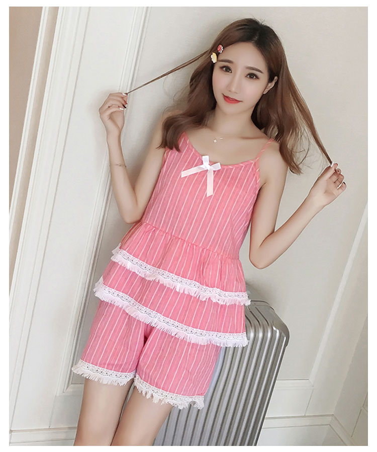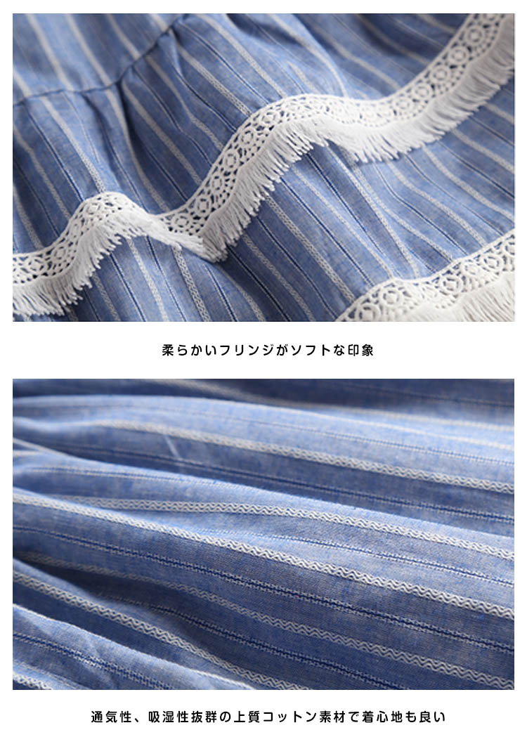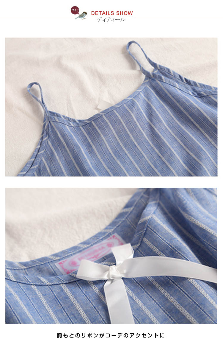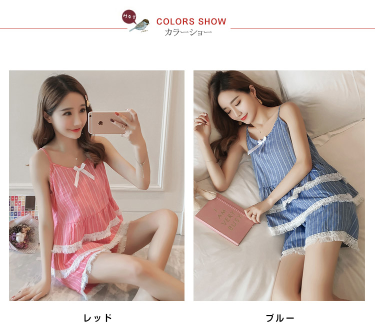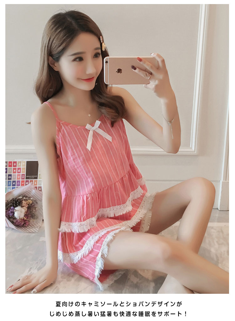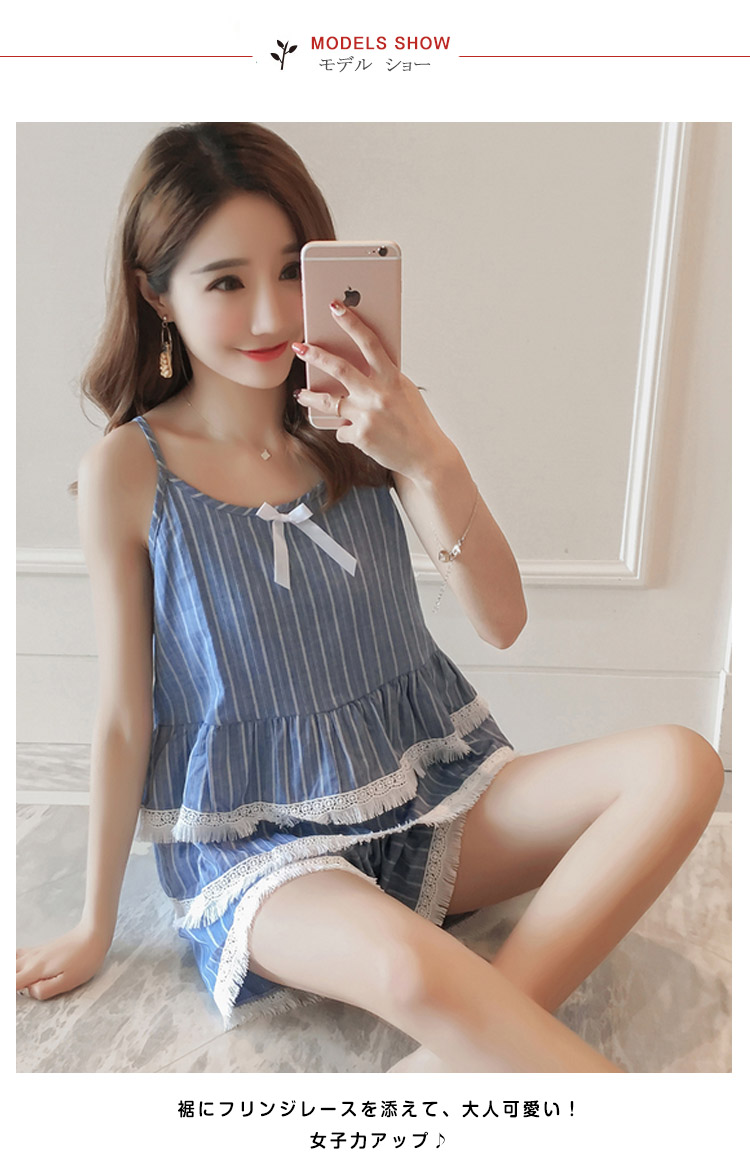 | 爽やかなストライプ柄が清楚で涼しいキャミパジャマセットアップ裾にフリンジレースを添えて、大人可愛い!女子力アップ♪ウェスト2段フリル切替で、美しいフォルムを生み出し、気になるお腹周りをきれいにカバーしてくれます。夏向けのキャミソールとショパンデザインがじめじめ蒸し暑い猛暑も快適な睡眠をサポート! | |