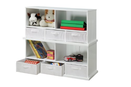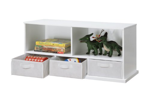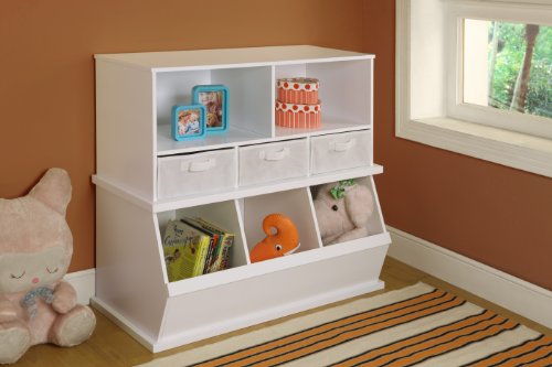 Badger Basket's Shelf Storage Cubby with Three Baskets is a sturdy, modular storage solution for keeping all sorts of items tidy and out of sight. Can be stacked with other bins to expand your storage capacity. Shelves are handy for books, magazines, toys, clothes, linens, shoes, VHS/DVDs, video games, and more. The three baskets are ideal for sorting and separating small items.Feature