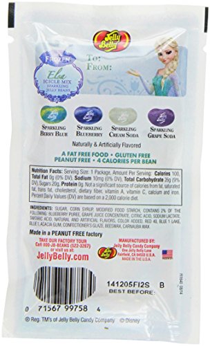 -. Feature : Jelly Belly Disney Frozen Jelly Beans, 1 oz. bag, 3 Pack / Mix Varieties: Sparkling Berry Blue / Sparkling Blueberry / Sparkling Cream Soda / Sparkling Grape Soda / Queen Elsa, P.R.Incess Anna or Olaf grace the front of each 1 oz bag. / All Jelly Belly jelly beans are OU Kosher; gluten free; peanut free; dairy free; fat free and vegetarian friendly. / Made in the USA