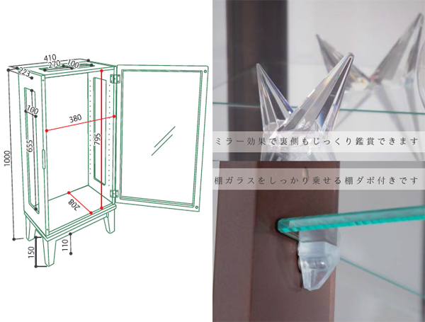 ●本体/MDF材、背面/3mm厚ミラー、扉/天然木・3mm厚ガラス、棚/5mm厚ガラス・4枚