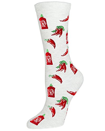 -. Binding : Apparel -. Brand : MeMoi -. Color : White -. Department : womens -. Feature : Sock features repeating pattern of sriracha bottles, single chili peppers, and clusters of chilis / Crew height / Fits sock sizes 9-11 -. Label : MeMoi -. Manufacturer : MeMoi -. ProductGroup : Apparel -. ProductTypeName : SOCKSHOSIERY -. Publisher : MeMoi -. Studio : MeMoi -. Title : MeMoi Sriracha Crew - Hot and Spicy Chili Novelty Socks for Women