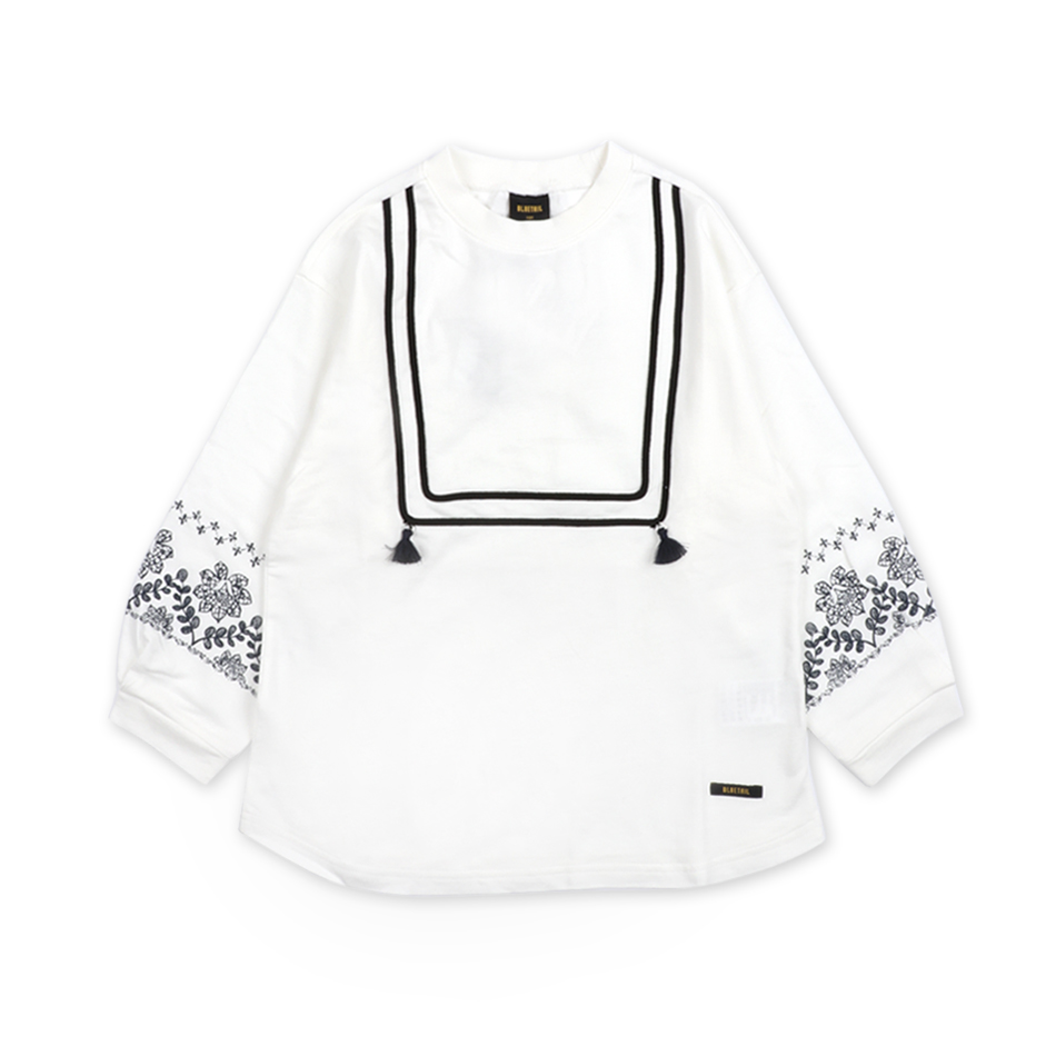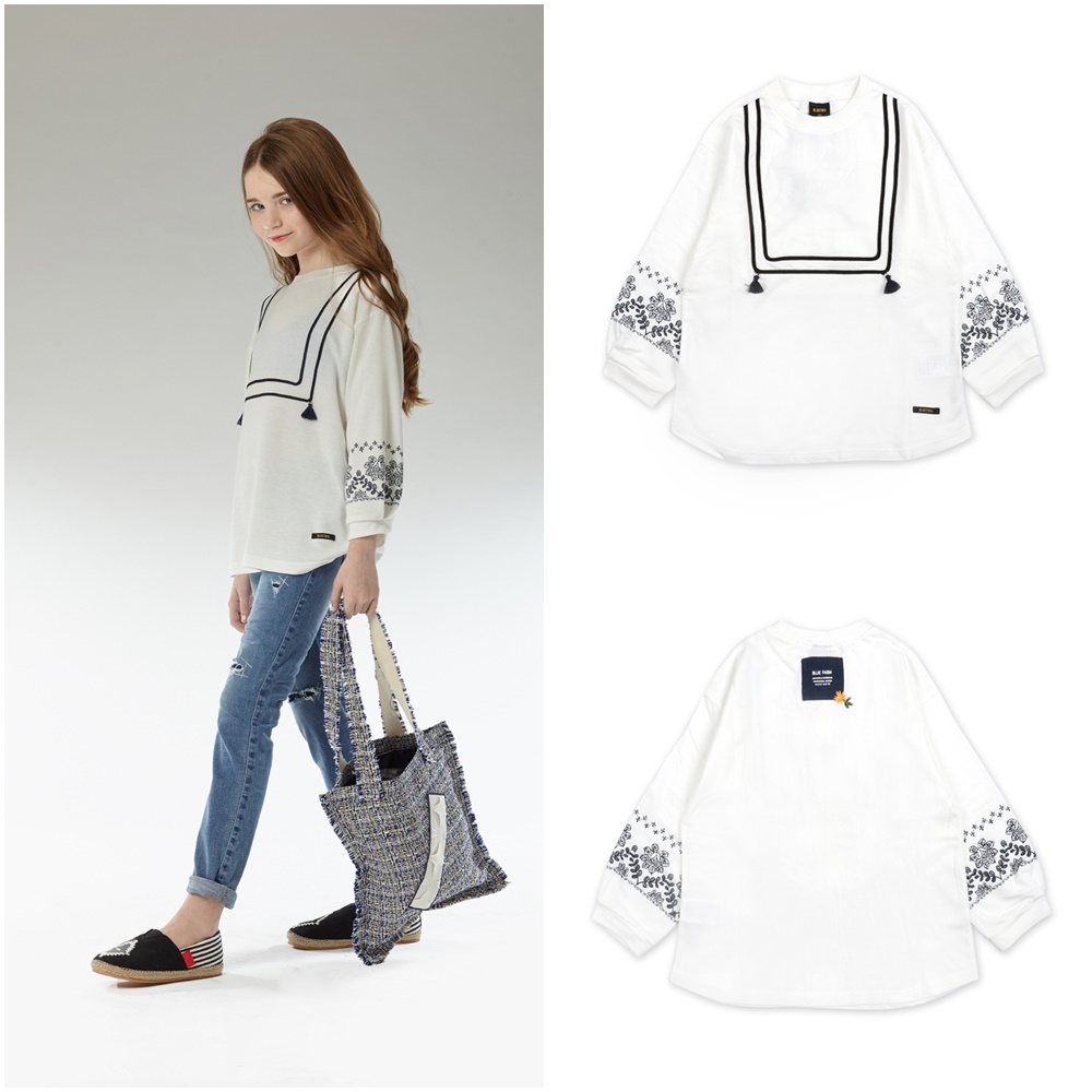 단정한 스퀘어 테이프 장식과 소매의 자수모양 나염이 블라우스를 입은 듯 단정하면서도 트렌디한 느낌을 줍니다.